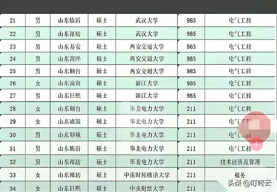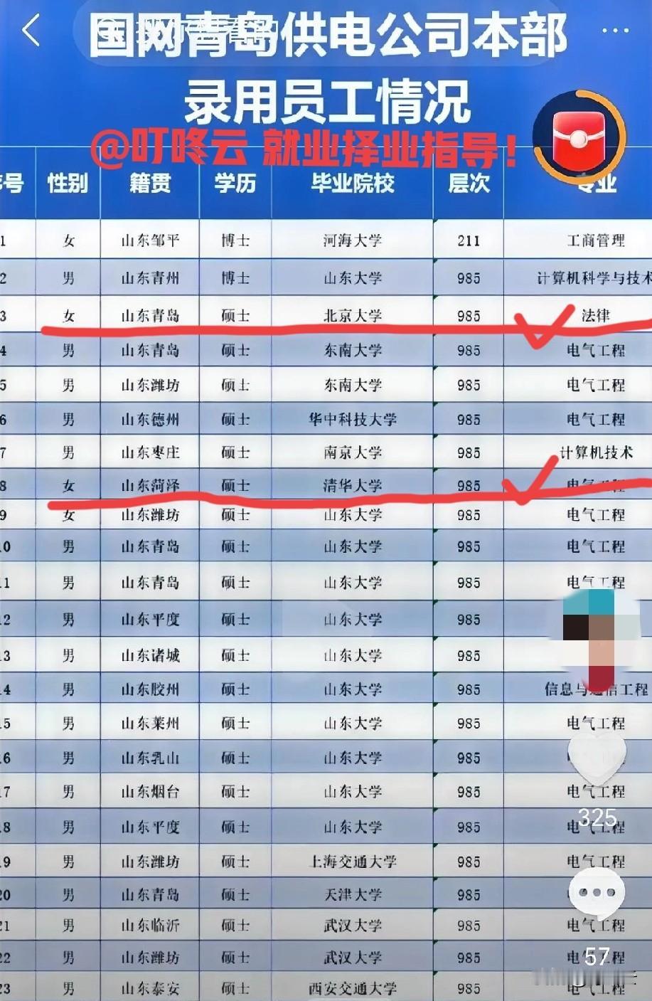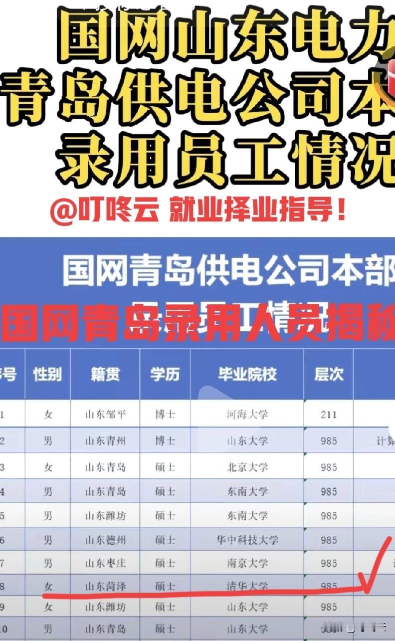 刚刚出炉!国家电网青岛市局26年第一批录用人员背景揭秘!一眼望去,满眼985!再一看全是硕士,山东大学在里面都不算什么!这种让人感觉到极度压迫感,内卷值100分!第一批录用全是硕士以上学历背景!985高校占比85%以上!博士有2个,河海大学、山东大学各一个!录用人员里面名校云集,浙江大学、南京大学、上海交通大学等等,还有山东菏泽的清华大学毕业生、青岛本地生源的北京大学毕业生!速速围观揭秘详细内容![点亮平安灯][点亮平安灯][来看我][来看我] 欢迎关注@叮咚云 将优先为粉丝职业规划指导,1对1咨询是付费服务,为你定制最适合的就业择业方案!欢迎留言交流讨论。[来看我][来看我] 免责声明:图片来自网络,仅供参考! 国家电网求职 电网求职