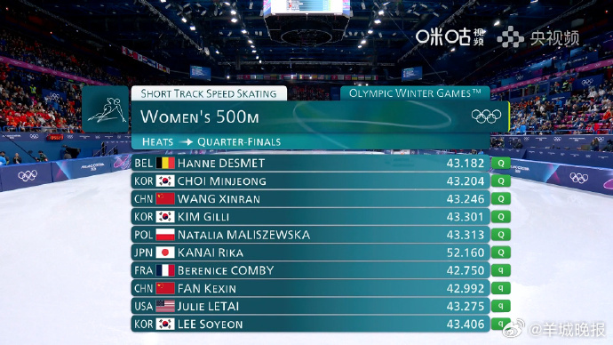 【#王欣然张楚桐范可新全员晋级#】米兰冬奥会短道速滑女子500米预赛,三位中国选手王欣然、张楚桐、范可新全部顺利晋级1/4决赛。#男子短道速滑1000米预赛##林孝埈晋级##女子短道速滑500米预赛##短道速滑混团接力##短道速滑 紧张#(咪咕体育)(编辑:郑宗敏;审签:周乐瑞)