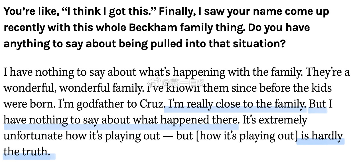 “关于这个家庭正在发生的事情,我无话可说。他们是一个非常非常美好的家庭。我在孩子们出生之前就认识他们了。我还是Cruz 的教父,和这一家人关系非常亲近。但对于那件事本身,我没有任何可以评论的。现在事情被呈现出来的方式,真的非常令人遗憾——而且这种呈现方式,几乎完全不是真相。”