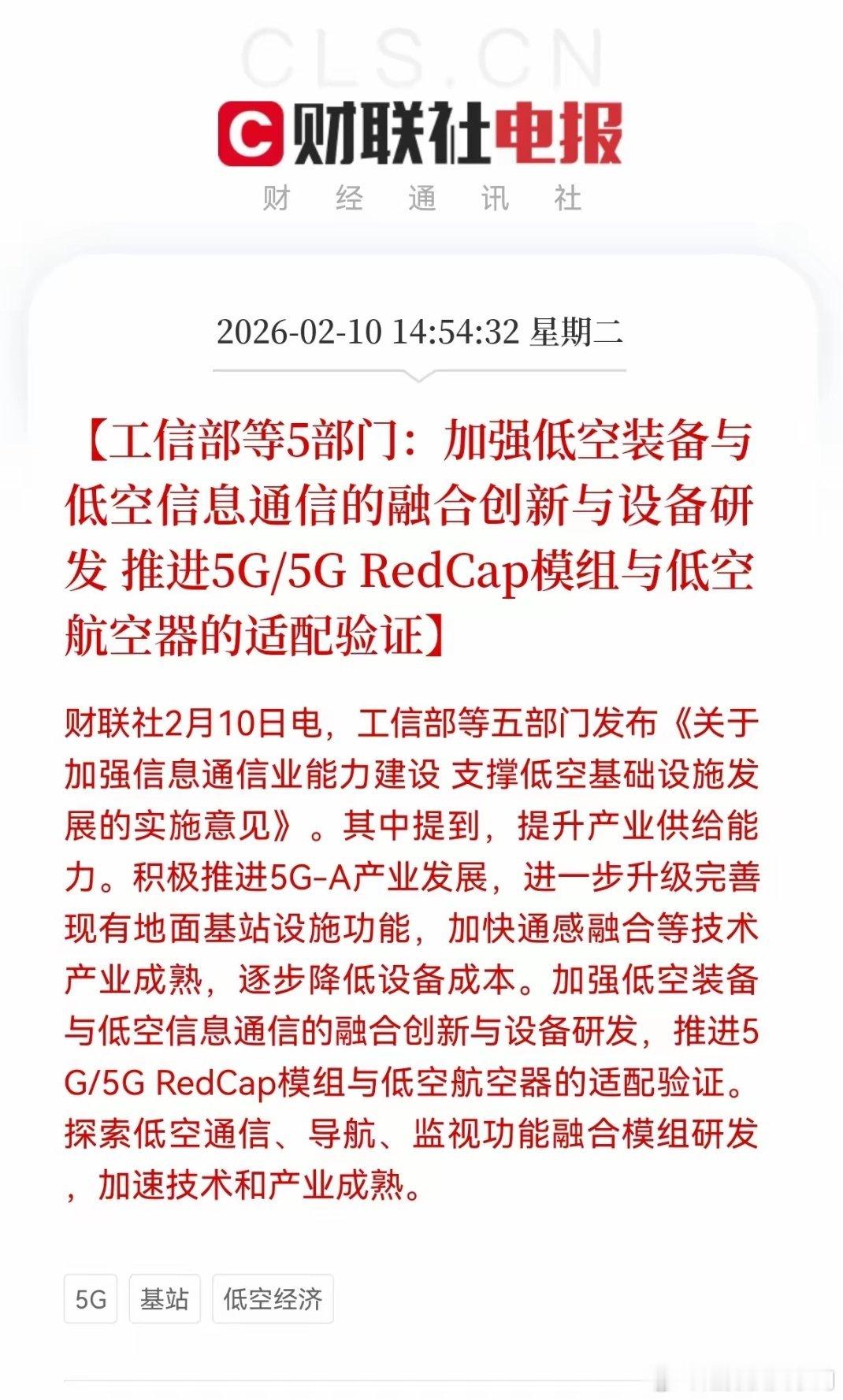 重大利好|低空经济+5G-A政策落地,A股新风口五部门发文,低空经济+5G/5G-A双轮驱动,通信赋能低空,万亿赛道加速落地。核心要点:- 推进5G/RedCap模组适配航空器,升级基站与通感融合- 2027年低空航路通信覆盖率≥90%,规模化建设启动三大核心赛道:- 通信设备:中兴通讯、通宇通讯- 5G模组:移远通信、美格智能- 低空装备/空管:航天彩虹、海格通信政策+市场共振,产业链迎业绩与估值双击。低空经济