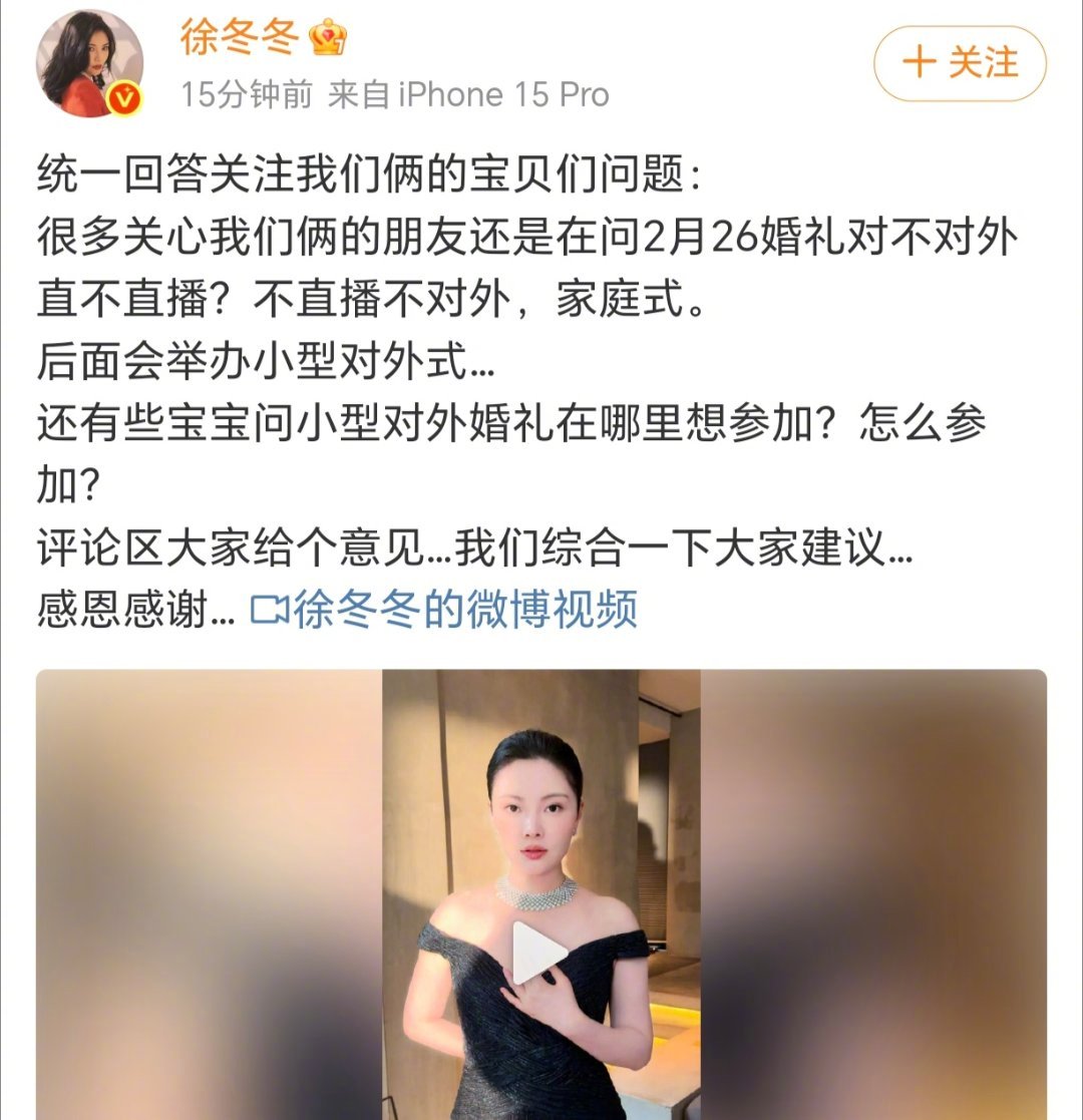 徐冬冬回应婚礼形式徐冬冬婚礼安排太清醒了!2月26日家庭式团聚,不公开不直播,没有浮夸排场,只有家人陪伴,还惦记着粉丝,后续小型对外场公开征集玩法,很宠了!