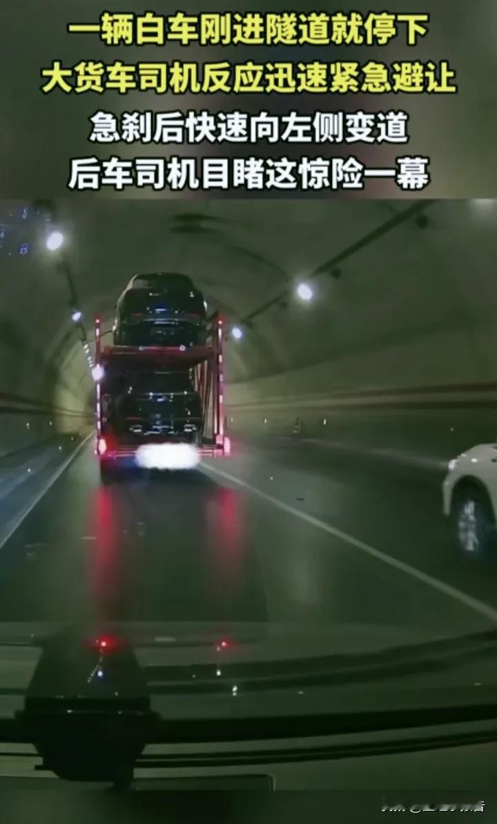 一白色汽车刚进隧道就停在了行车道上,后方加长货车紧急变道并连续刹车才避免了一起追尾事故。 这是后车行车记录仪拍摄到的画面,真心为这位善良的货车司机点赞,和大家一样我也觉得我们应该让速不让道,当路上遭遇这种情况哪怕直接撞上去。 很多人把道路作为可走可停的地方,甚至是高速公路上也有人随意停车。我就经历过一次在高速公路最左侧超车道上,前方小汽车突然停车,我简直把刹车踩冒烟了才刹停,原来这位司机是想变道到右方进入服务区,但奈何右侧车道一直有车,自己又想进服务区,干脆直接停车“等候”。 临近春节,各种“奇葩”司机纷纷上路,今天给各位司机提个醒,安全才能过节!(截图自网络视频)