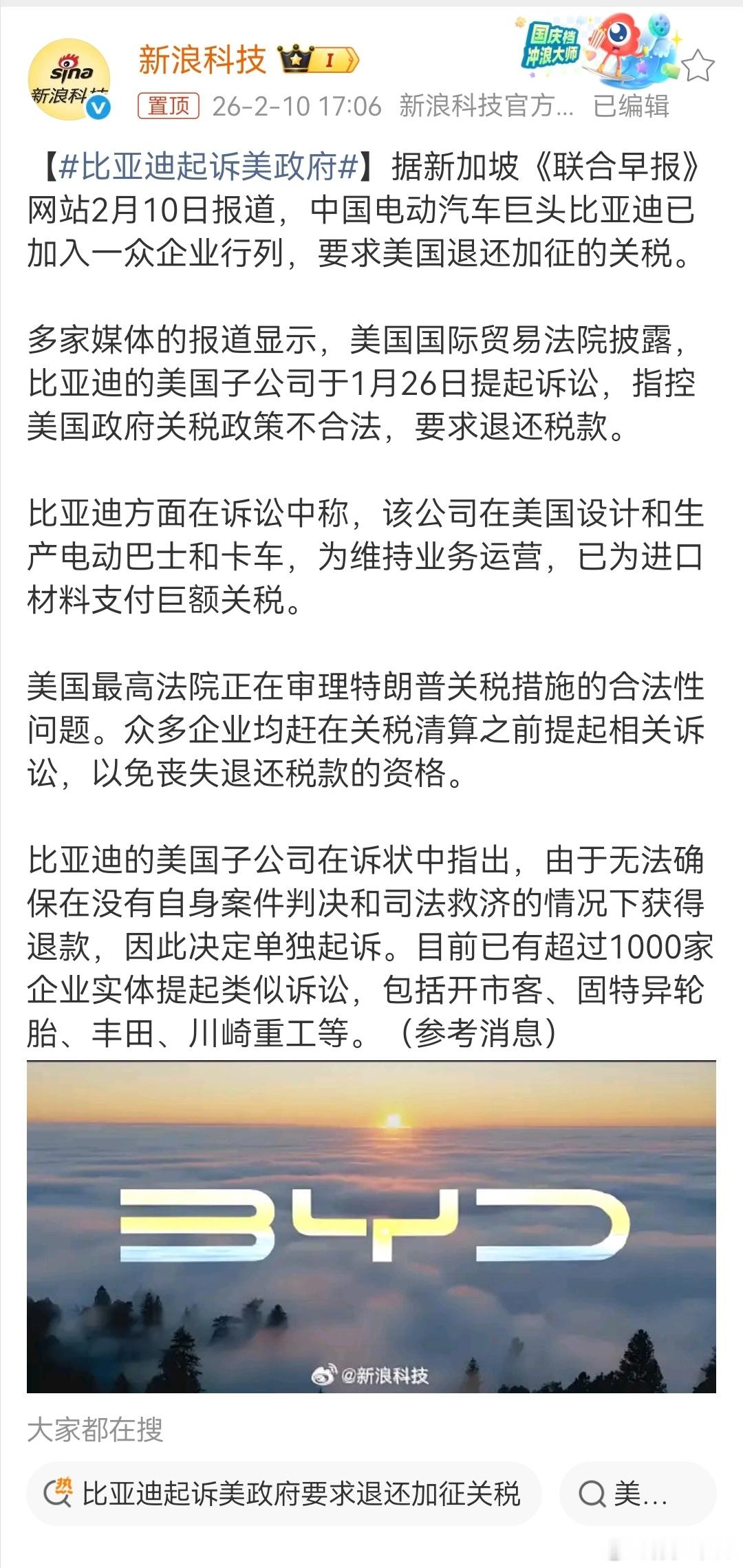 比亚迪的美国子公司于1月26日提起诉讼,指控美国政府关税政策不合法,要求退还税款。