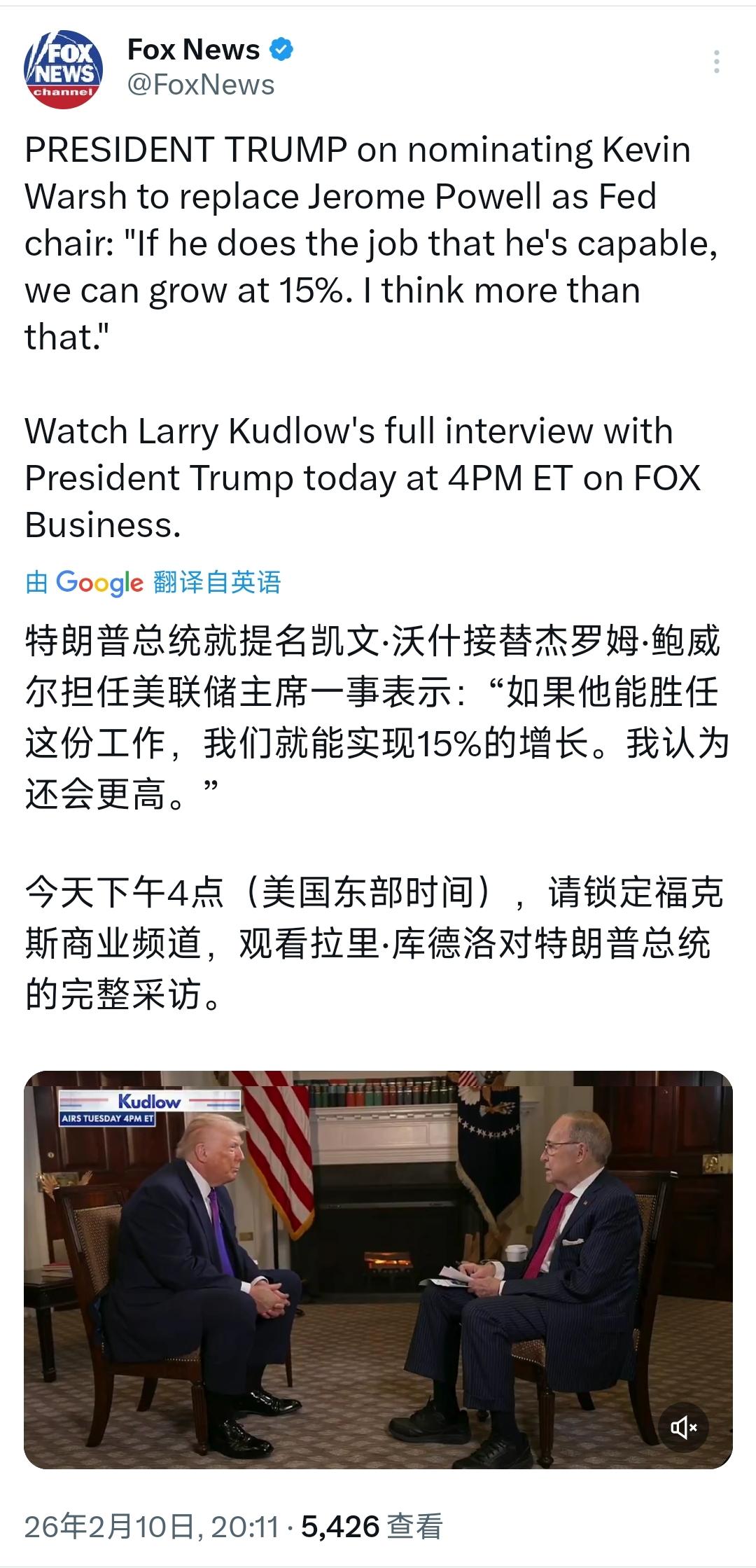 特朗普今天(北京时间2月10日)就提名凯文·沃什接替杰罗姆·鲍威尔担任美联储主席一事表示:“如果他能胜任这份工作,我们就能实现15%的增长。我认为还会更高。” [机智]评几句:特朗普再次嘴炮画大饼。他的这番言论完全无视基本经济规律,纯属信口开河。美国经济长期增速稳定在2%左右,即便巅峰时期也远达不到15%,这是由产业结构、人口、生产率等客观条件决定的,绝非更换一位官员就能凭空实现。特朗普把货币政策当作政治工具,肆意打压鲍威尔、吹捧亲信,本质是为了造势捞取政治资本,既不尊重美联储独立性,也不尊重经济运行常识。