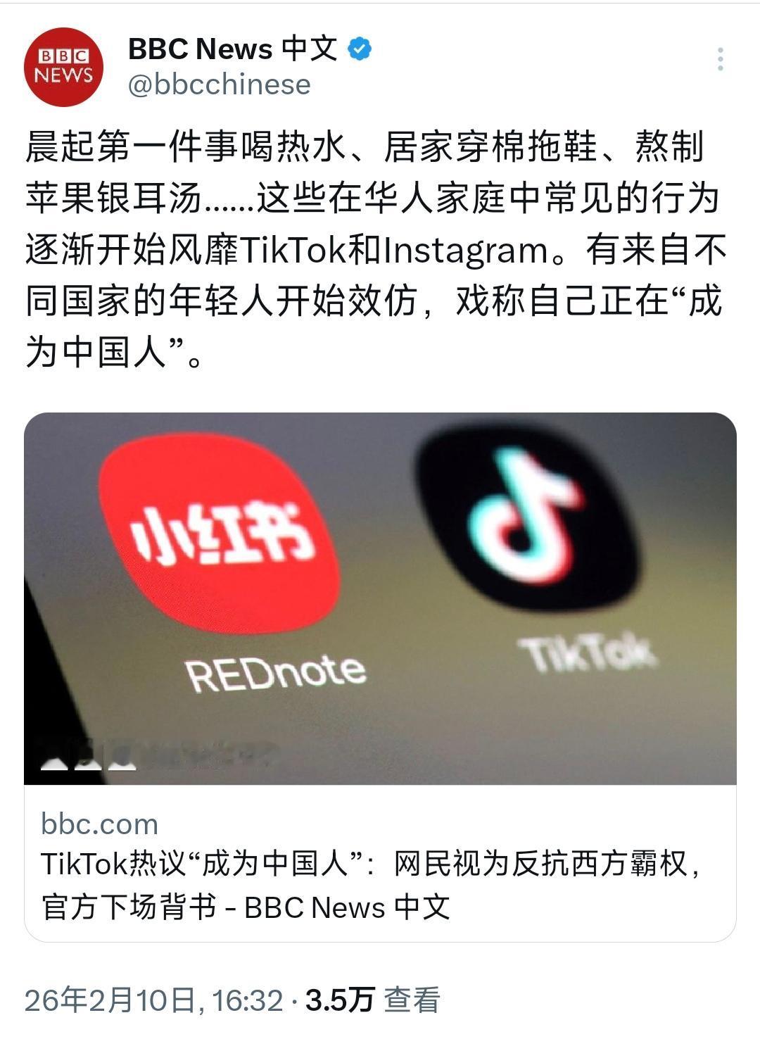 BBC中文网今天(2月10日)写道:“晨起第一件事喝热水、居家穿棉拖鞋、熬制苹果银耳汤……这些在华人家庭中常见的行为逐渐开始风靡TikTok和Instagram。有来自不同国家的年轻人开始效仿,戏称自己正在‘成为中国人’。” [机智]说两句:这三个习惯,我有两个。苹果代替雪梨还是那个效果吗?