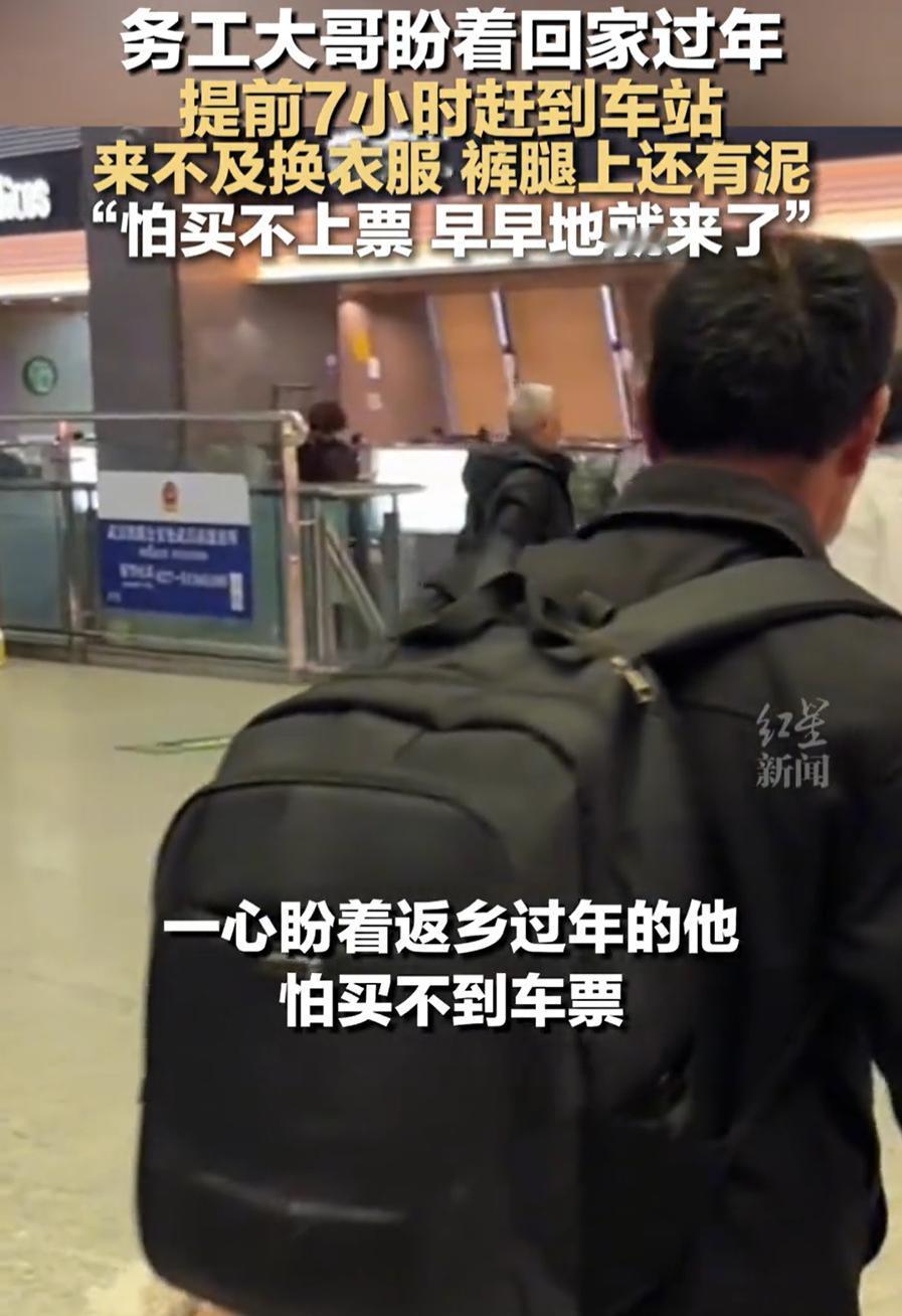 看哭了!湖北武汉,一位务工大哥想要回河南老家过年,当天下着大雨,早早7个小时就来到火车站买票,而他到火车站时甚至裤子上已经都是泥巴,但对他来说,能买到票回家,其他的都不重要 这位58岁的大哥从河南南阳内乡来,在武汉干了七十多天电焊。年底结账,扣除吃住开销,净落一万六。他捏着这笔钱,心里踏实,回家过年,给老伴添件新衣裳,给孙子包红包,都指望它了 春运票紧张,他不太会用手机抢票,就认准了老办法:早点去车站排队。凌晨三点从工地出发,雨天路滑,半道上还摔了一跤。泥水浸透了工装裤,他没顾上擦,直奔售票窗口 他递上证件,说了老家县城的名字。售票员敲了几下键盘,幸运的是买到了车票,这7个小时对他来说就不算漫长 其实仔细想想,现在很多人已经可以在线上买票,方便了不少,但也有像这位大哥一样,还是选择亲自去车站排队买票。技术进步确实让大多数人更方便了,但总得有人等等那些跟不上速度的人 他裤腿上的泥,是从工地到车站一路的痕迹,也是无数普通人过年回家的朴素写照,不管路上多狼狈,只要最终能坐在回家的列车上,一切都值了 过年对中国人来说,从来不只是节日,它是一种必须要完成的抵达。无论用手机还是排队,无论衣冠整洁还是裤腿沾泥,方向都是一样的:回家