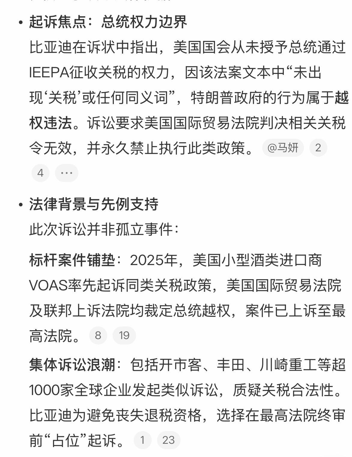 比亚迪四家美国子公司正式起诉美国政府,挑战特朗普援引《国际紧急经济权力法》(IEEPA)征收关税的合法性,并要求退还自2025年4月以来缴纳的全部关税及利息,成为中国车企首次就美国关税政策发起的法律行动。 比亚迪牛逼啊,硬刚美国政府,硬刚特朗普啊[不愧是你][不愧是你][不愧是你]