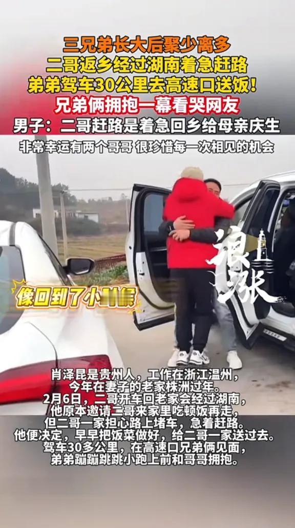 泪目了!湖南,哥哥开车回家过年,途中会路过弟弟家,弟弟专门驾车30公里去高速口给哥哥送饭,兄弟俩一见面就紧紧拥抱在一起,又蹦又跳的,开心得像个小孩子。 这事发生在2月6号,弟弟肖泽昆是贵州人,在浙江温州打拼,今年在妻子的老家株洲过年。二哥开车回贵州老家,刚好要经过湖南。肖泽昆一开始还挺开心,想着终于能让二哥来家里吃顿热乎饭,好好唠唠嗑。可二哥那边一合计,春运高速堵得吓人,晚走一步都可能耽误给老母亲庆生的正日子,只能咬咬牙说“饭就不吃了,赶路要紧”。 肖泽昆听完没多说,挂了电话就扎进厨房。他知道二哥一家路上啃面包、喝凉水的滋味,也知道这趟回家路,二哥心里装的全是对老母亲的牵挂。他把家里能拿得出手的菜都翻了出来,炖了汤、炒了肉,还特意打包了几样二哥小时候最爱的家乡菜,连保温桶都擦得锃亮。然后揣上车钥匙,一脚油门就往高速口赶——30多公里,不算近,但在他心里,这是能让二哥少饿一会儿的路,是能让兄弟俩多待几分钟的路。 等二哥的车刚停稳,肖泽昆就像小时候放学那样,一路小跑着扑过去。二哥也赶紧推开车门,两个人没等说话,先狠狠抱在了一起。那一下拥抱,没有客套,没有寒暄,就像小时候抢糖吃、一起挨揍时那样,带着点莽撞,又带着点说不出的踏实。肖泽昆说,那一瞬间真的像回到了小时候,好像下一秒就能听见大哥在后面喊“别闹了,回家吃饭”。 现在的人总说,长大了就身不由己。三兄弟天各一方,大哥在外地,二哥回了老家,肖泽昆又在湖南安了家,一年到头能凑齐的日子屈指可数。以前总觉得“来日方长”,可真到了要见一面都得掐着时间、算着路程的时候,才懂“聚少离多”这四个字有多沉。 有人说,不就是一顿饭吗?至于跑30公里?可只有在外面漂过的人才懂,这哪里是一顿饭啊。这是在提醒二哥“你不是一个人在赶路”,是在告诉二哥“家里有人惦记你”,更是在给这份被距离和时间冲淡的兄弟情,续上一口热乎气。现在的我们,总忙着搞钱、忙着应酬,连给家里打个电话都要找“有空再说”的借口,可肖泽昆用30公里的车程告诉我们:有些东西,比时间和距离更金贵。 当然,也有人会说,这不过是自媒体博眼球的戏码。可当你看见视频里,两个大男人抱着又蹦又跳,像孩子一样笑出眼泪的时候,就会明白,这份情感骗不了人。我们之所以会被戳中,不是因为这事儿有多惊天动地,而是因为它照见了我们自己——我们心里都藏着这样一个人,可能是兄弟,可能是发小,可能是远在老家的亲人,我们也想不顾一切地奔过去,说一句“我想你了”。 在这个人人都喊着“年味淡了”“人情薄了”的时代,这样的故事反而更珍贵。它不是在贩卖感动,而是在提醒我们:别让“忙”成为借口,别让“下次”变成遗憾。那些藏在饭香里的牵挂,那些跑着去见的人,才是我们在这个世界上最扎实的底气。 各位读者你们怎么看?欢迎在评论区讨论。