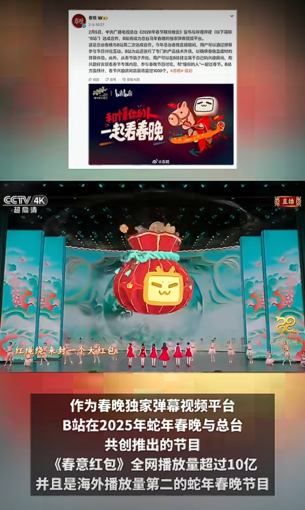 #B站UP主首次参与春晚共创# 每年的春晚,都会有很多新鲜的模式,比如2026年春晚,B站成了春晚独家弹幕视频平台。