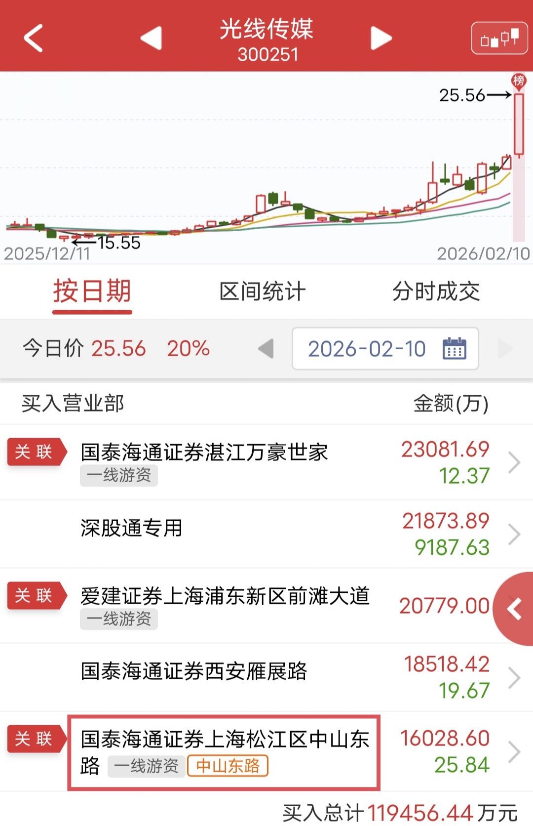 中山东路1.6亿尾盘加筹码顶上! 今天光线传媒开盘后涨停。 盘后龙虎榜显示,