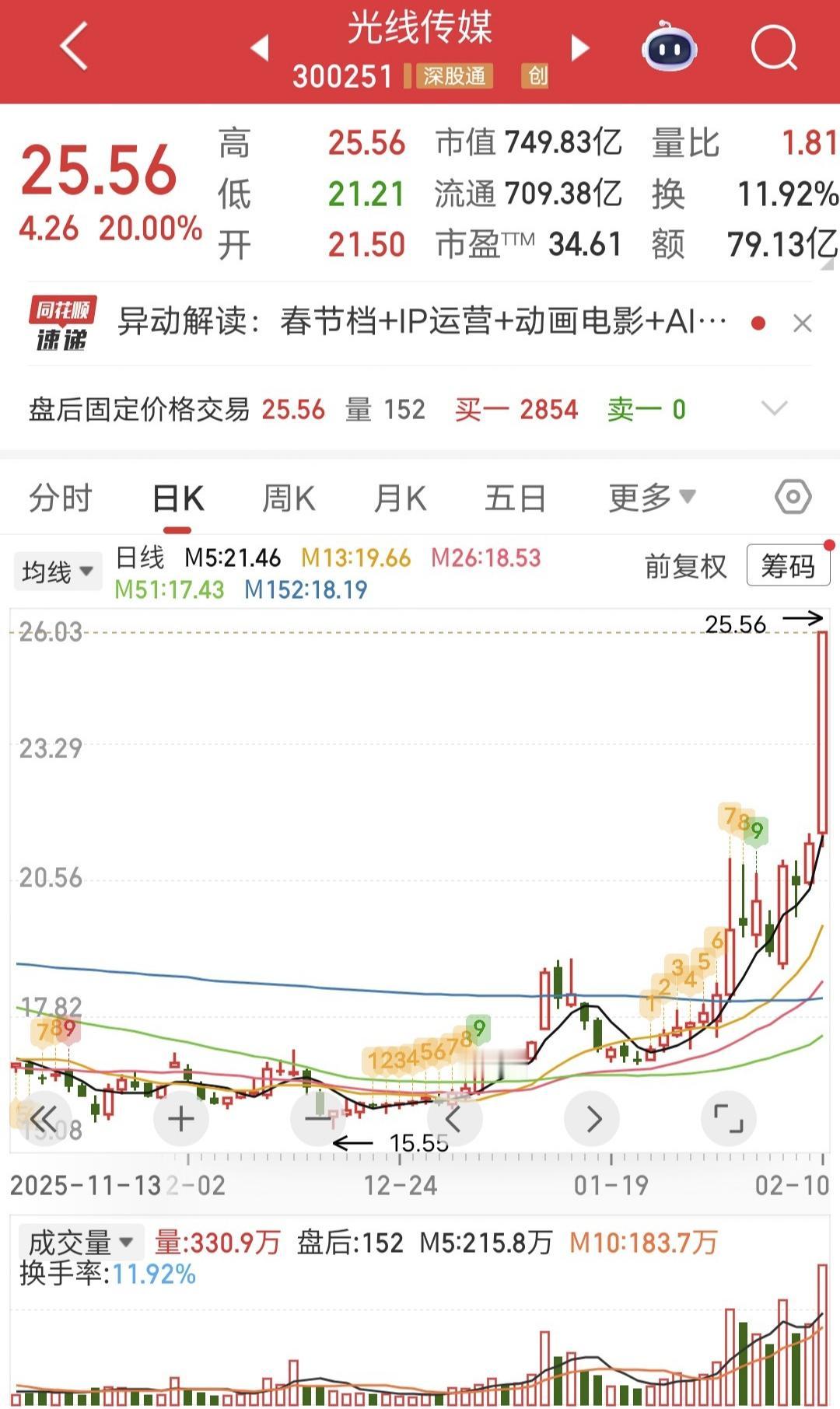 中山东路1.6亿尾盘加筹码顶上! 今天光线传媒开盘后涨停。 盘后龙虎榜显示,中山东路买入1.6亿。 从分时图看尾盘再加筹码顶上,牛啊!