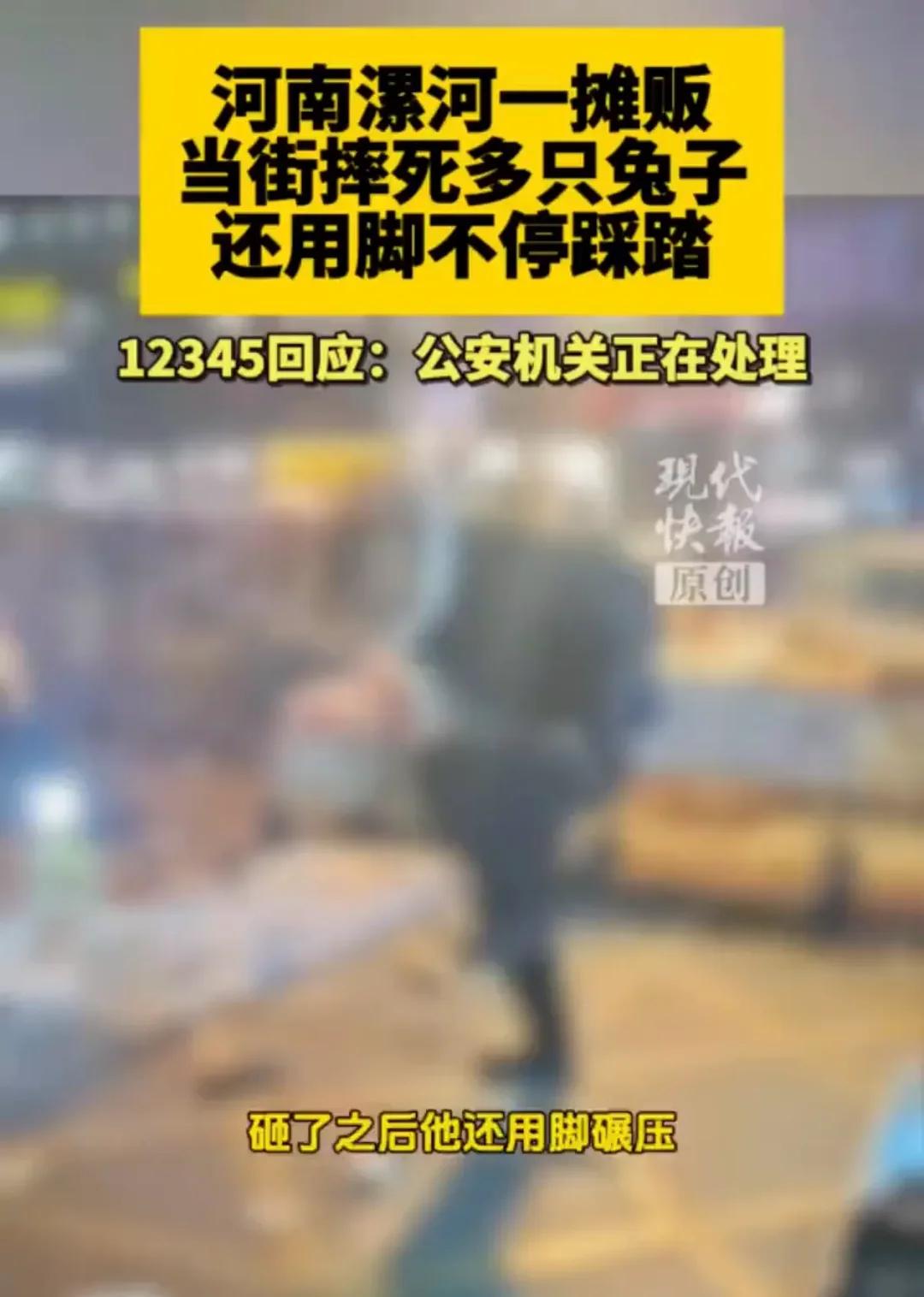 河南省漯河市昌建广场。 男子看到一名卖兔子的摊贩当街摔兔子,然后用脚碾压,兔子的