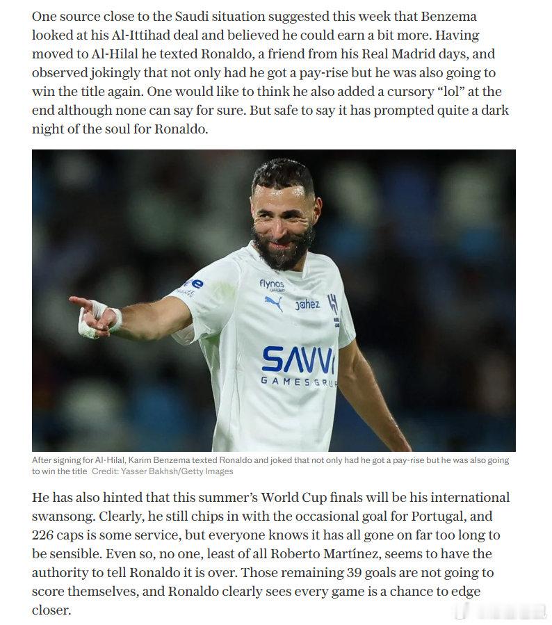 【】《电讯报》:本泽马认为转会利雅得新月后,他可以赚得更多。转会完成后,本泽马给C罗发了消息,开玩笑地表示,他不仅加薪了,还会再次赢得冠军。人们可能会认为本泽马在结尾处加了一个lol,但可以肯定的是,这会让C罗度过一个深思的夜晚。