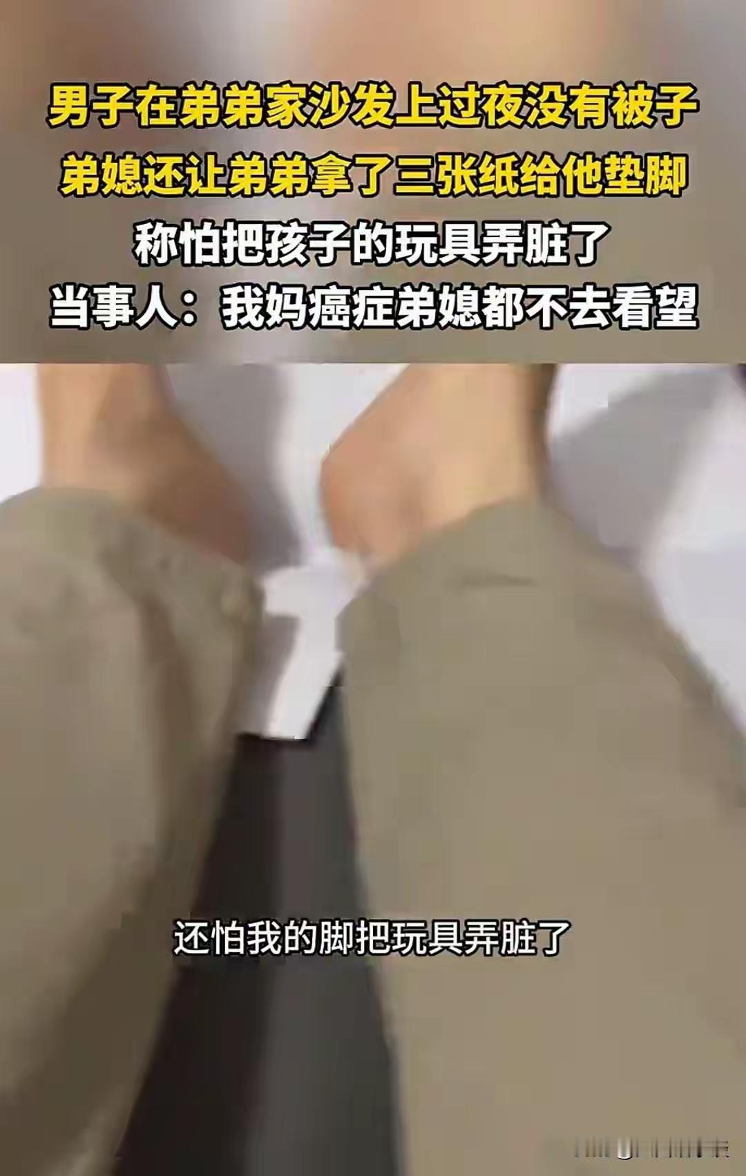 2月8号广东省广州市一男子母亲癌症住院治疗,他己经在医院里护理了好几天了,想回家休息一下但是离医院太远了,不方便,他想到了弟弟豪离医院近,晚上就去弟弟家借宿,弟弟同意了就让哥哥睡在沙发上,也没有给拿被子,并且是拿来几张纸给哥哥垫脚,弟媳妇怕哥哥的脚给沙发弄脏了,哥哥一气之下从弟弟家出来了回到自己的车子休息了一晚上,广州这几天夜里还是较冷的,哥哥吐槽弟媳妇知道母亲癌症住院治疗从来没有来看过,这个弟媳妇太差劲了。