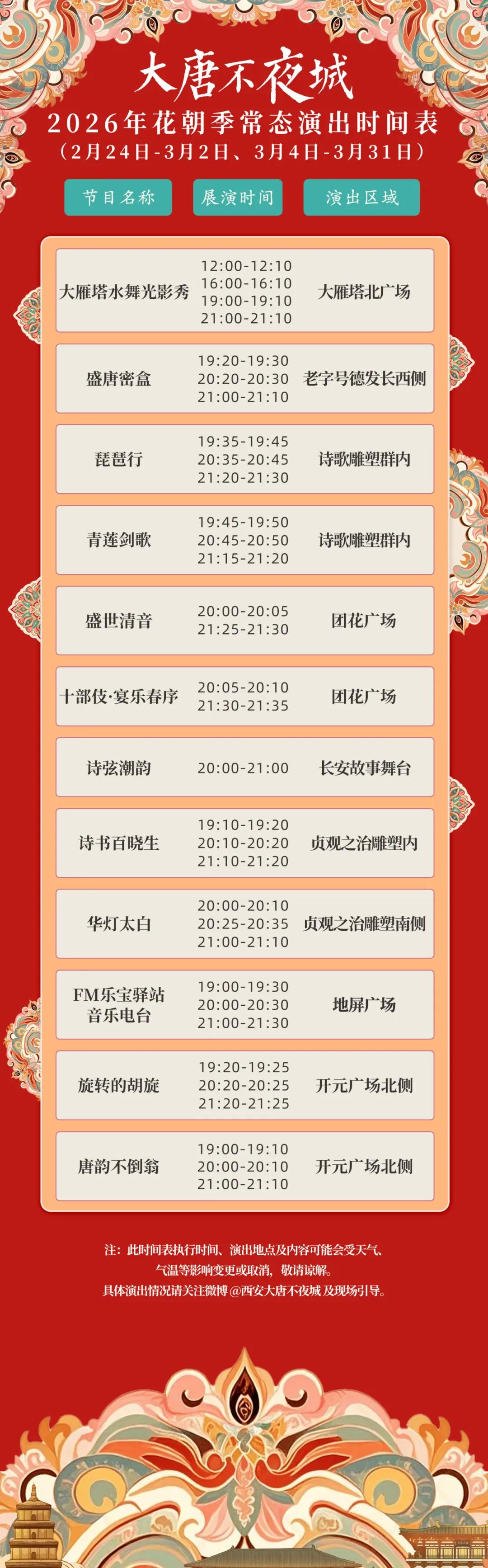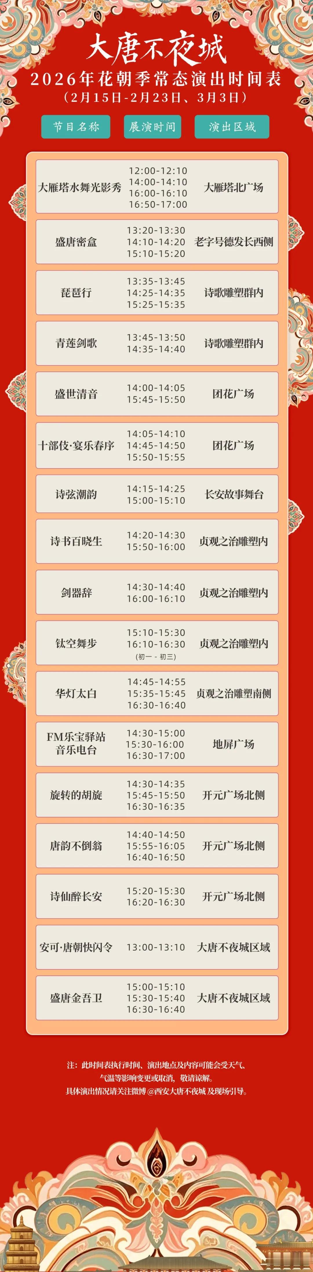 2026大唐不夜城新春演艺时间表及游览导航,春节期间游玩不夜城必备!春节的脚步越来越近,大唐不夜城的年味早已拉满!灯火如昼、唐韵流转,这里正酝酿着一场跨越千年的新春盛景。 为了让每位游客的沉浸之旅更顺畅、更尽兴,@去西安 特分享2026大唐不夜城新春演艺时间表 ,带你抢先掌握精彩演出的每个高光时刻。记得收藏安排,合理规划动线,一起畅游盛唐天街,不负佳节好时光!