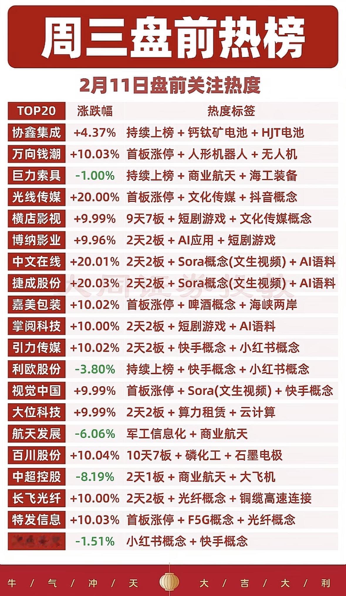周三大盘前20热榜,涨跌榜揭晓! "周三盘前热榜:协鑫集成领涨钙钛矿电池,万向钱潮机器人涨停,光线传媒影视爆发,中文在线AI语料火热,航天概念震荡调整。"