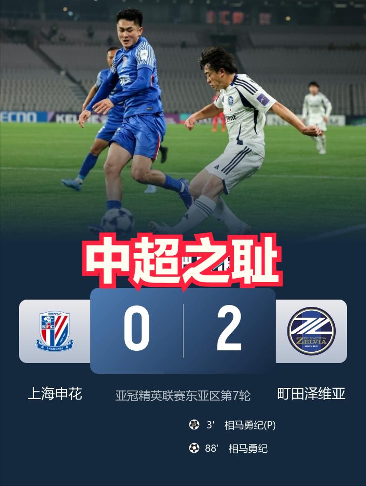 输输输输输,提前被淘汰,内战掉链子,外战丢面子! 在刚刚结束的亚冠精英联赛东亚区第7轮比赛中,上海申花坐镇主场迎战日本J联赛的町田泽维亚,上半场上海申花后卫金顺凯开场30秒就送点,申花天崩开局0-1落后;下半场相马勇纪上演梅开二度,最终上海申花0-2输给了町田泽维亚,遭遇亚冠4连败提前一轮无缘东亚区8强。 由于下赛季开始中超在亚冠只有1.5个名额了,这也许是申花最后一次参加亚冠了,1平1胜5负排名倒数第二的战绩也许是申花在亚冠最后的回忆了,唯一的安慰就是比同城对手上海海港排名能高一点。 亚冠东亚区12支球队8支晋级淘汰赛,结果中超三强排名倒数第三,真的是不忍直视。幸好以后中超亚冠的名额越来越少了,要不然每年的亚冠都看着窝心。