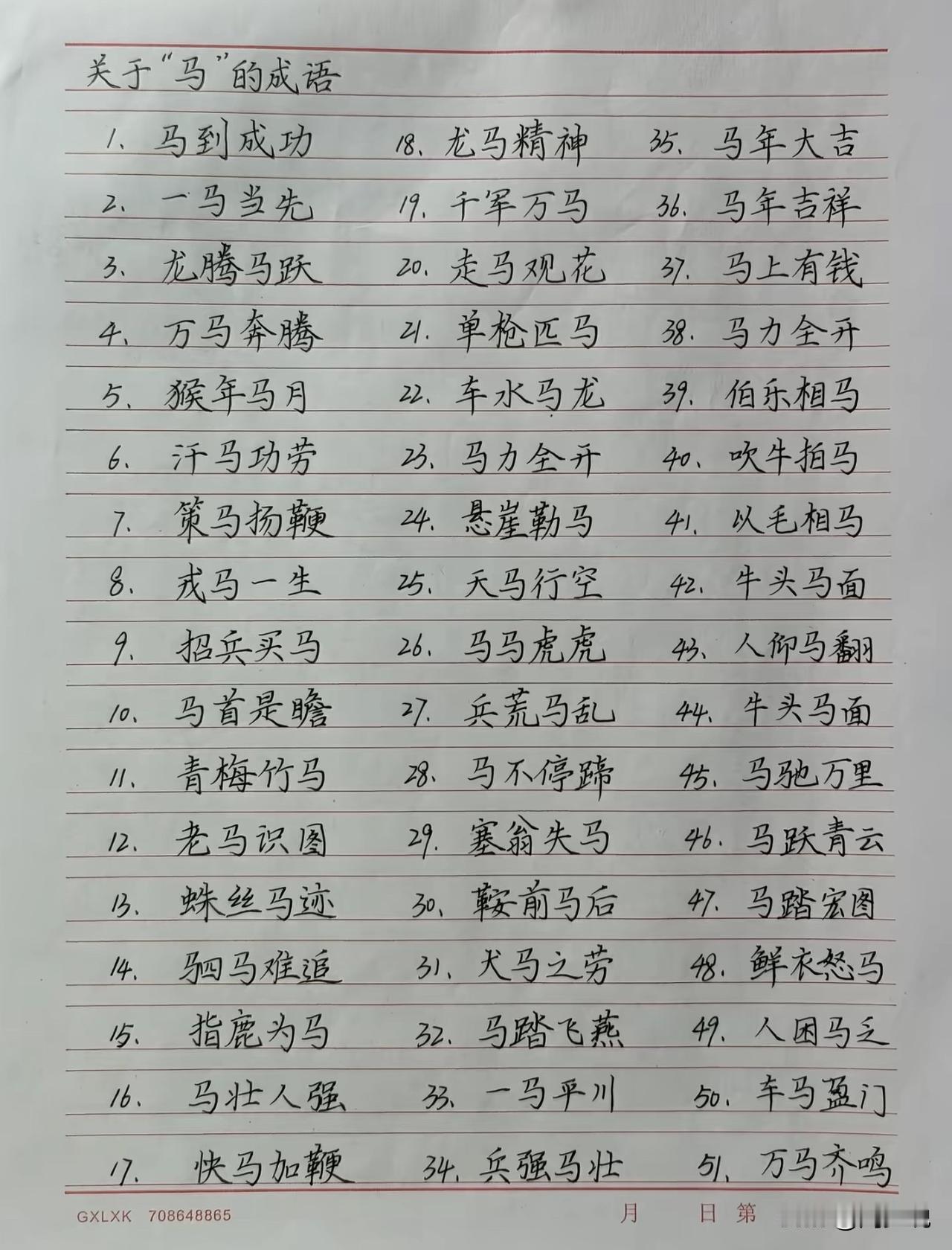 关于“马”的成语,全都写在这张纸上了,什么马到成功、一马当先、万马奔腾、汗马功劳、戎马一生、策马扬鞭以及招兵买马等常见成语,家长们保存下来,没事带着孩子一起读一读,孩子能把这些成语牢记,不但能增加成语知识积累,以后考试也能随时用上。#寻美三湘#