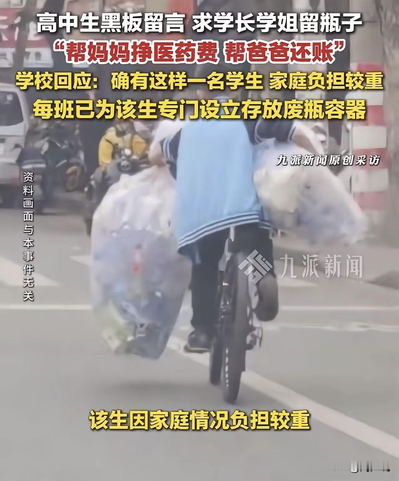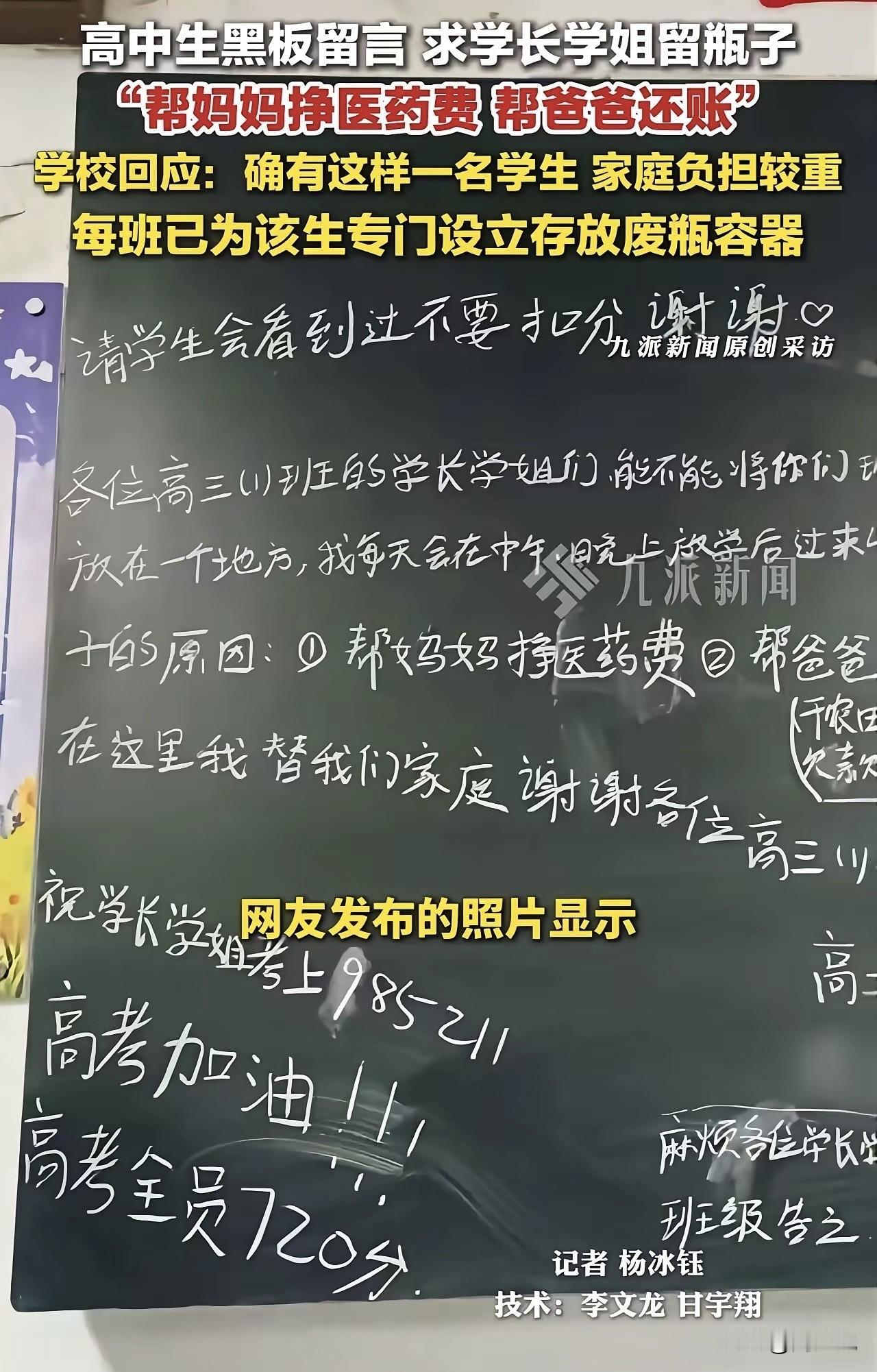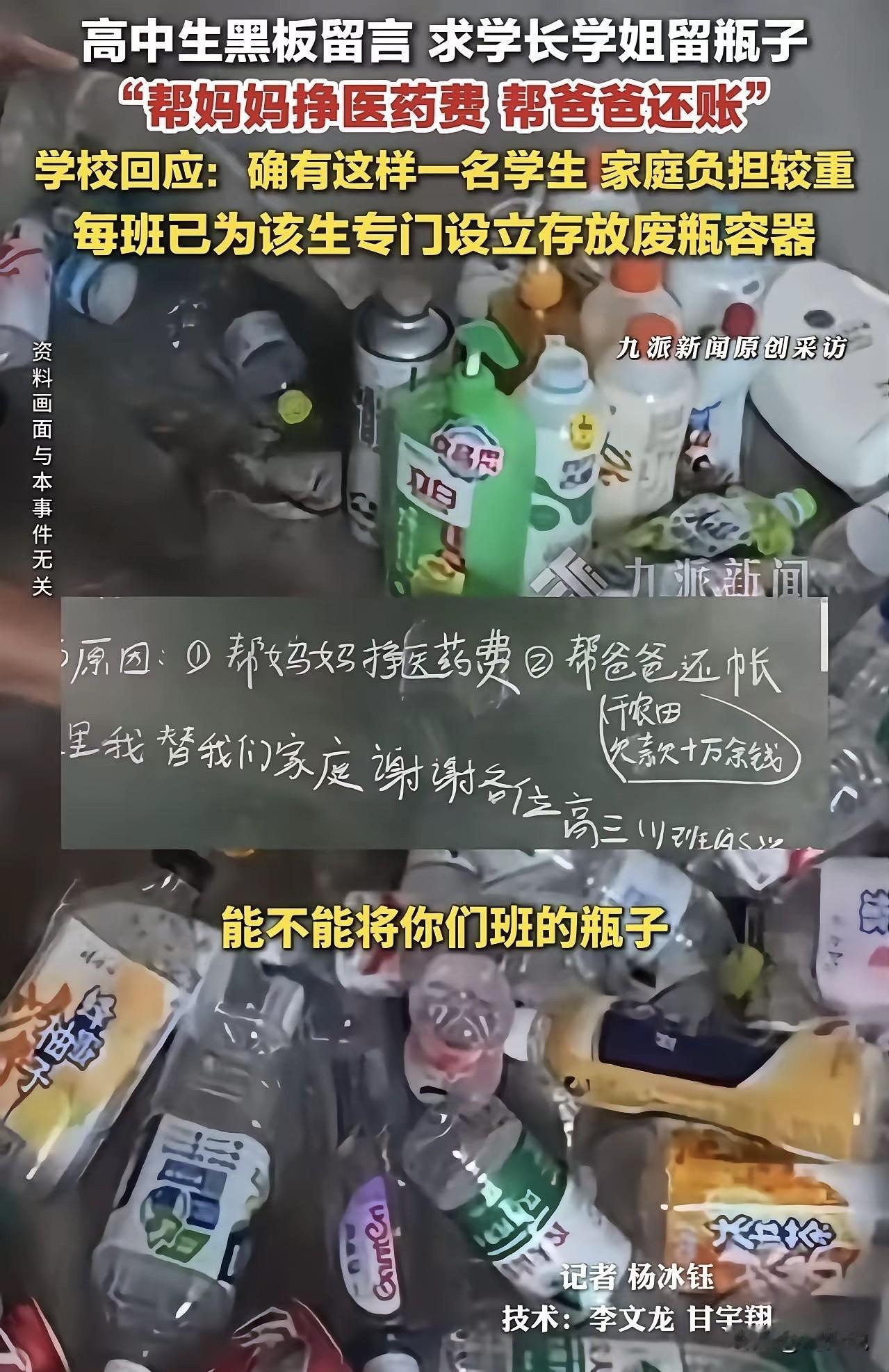 “看哭了!”刷到一个视频,河南一所中学,一位高二男生在黑板上认真写下一行字:求学长学姐把喝完的瓶子留给我,我想帮妈妈挣医药费,帮爸爸还债。怕给班级添麻烦,他还特意先标注“请学生会看到不要扣分”,并承诺每天两次准时来收瓶子。 原来,男生的母亲重病卧床,父亲早已欠下十多万外债。小小年纪的他,没有抱怨生活,只想靠捡瓶子,为家里多撑一点是一点。 学校得知后,立马在每个班级放上了专用收集箱,用温柔的方式守护着少年的自尊。 这事在网上传开后,网友看法不一。有网友感慨:“穷人家的孩子早当家,这份懂事,看着真让人心疼。” 也有人说:“不偷不抢靠自己,这才是真正的少年志气。” 在周少看来,这个男孩没有惊天动地的举动,却用最朴素的行动,扛起了超出年龄的责任。他懂得体谅父母,顾及集体,自尊又自强,远比空洞的口号更有力量。 生活或许不够温柔,但他没有选择低头。如此来看,真正的成长,从来不是年龄的增长,而是学会为家人分担。 这样的少年,哪怕身处困境,眼里依旧有光。他用行动告诉我们,孝顺与担当,从来都不分年纪,也正是这份平凡又坚定的善良,最能打动人心。#寻美三湘#