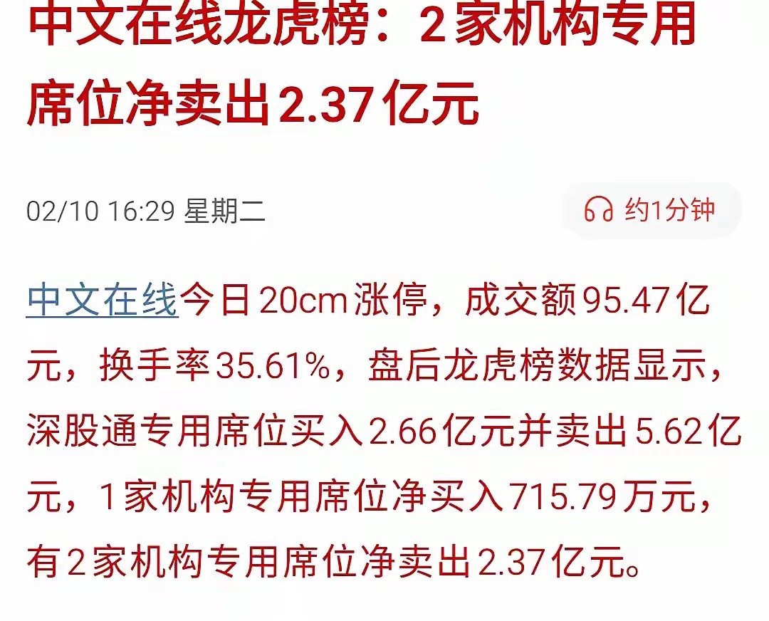 中文在线连续两天20cm涨停,今天成交额爆量到95亿、换手超35%,情绪直接拉满。结合两天龙虎榜看,这是一场游资猛拉、机构分批撤退、外资高抛低吸的典型大戏。