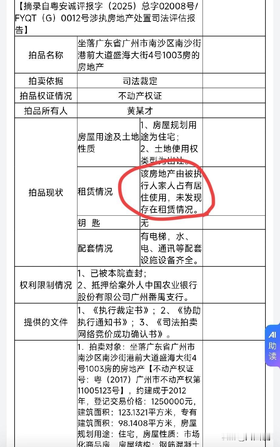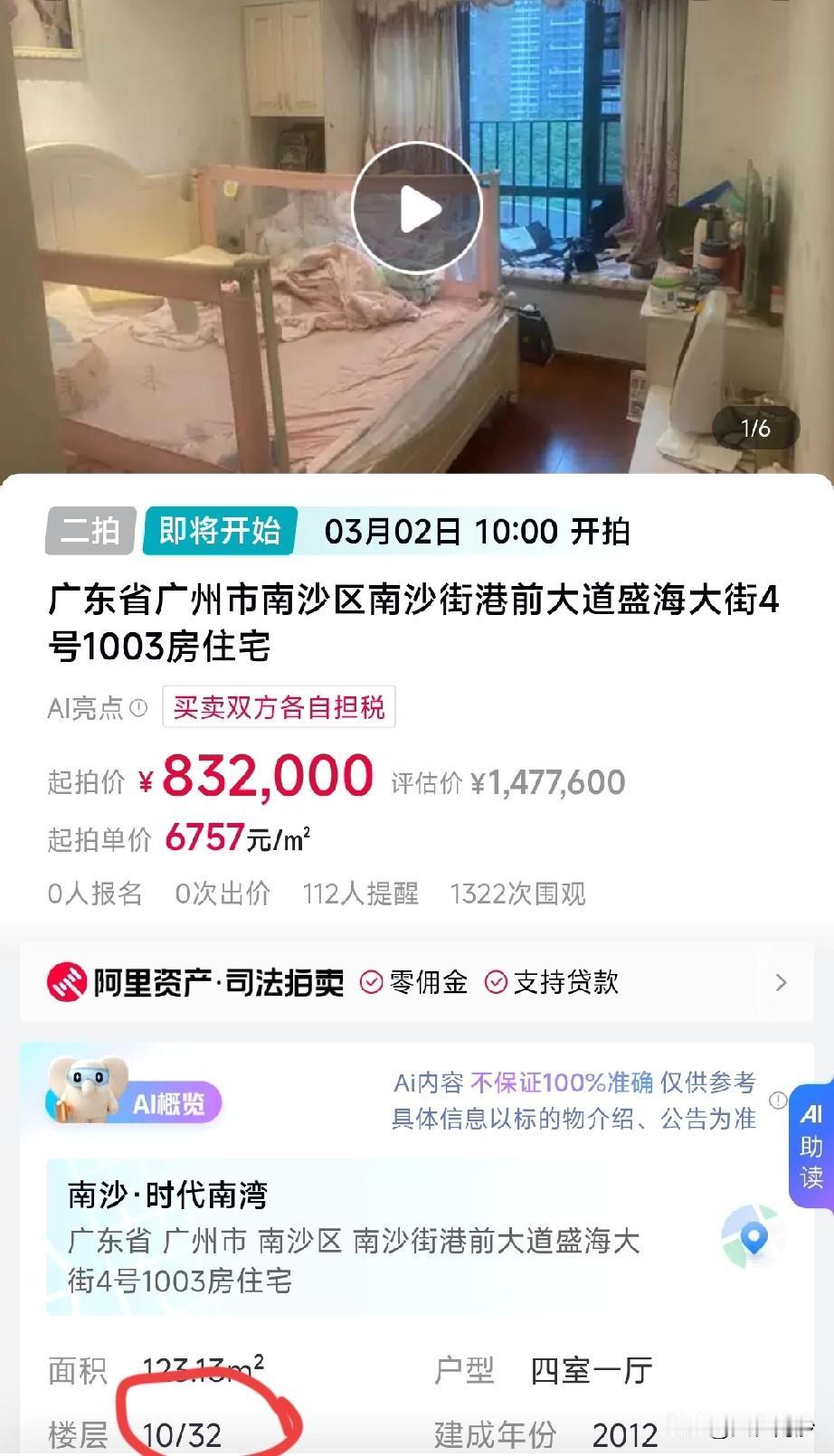 【南沙法拍】南沙法拍又来笋盘了,时代南湾123方大四房,二拍起拍价只要83.2万,折单价只要6千多一平。根据介绍这套楼层在10层,是很不错的楼层了,而且阳台看别墅区,视角十分的开阔。 更加重要的是房子写明了没有租赁的情况,而且有进去拍视频,意味着房主还是十分合作的。