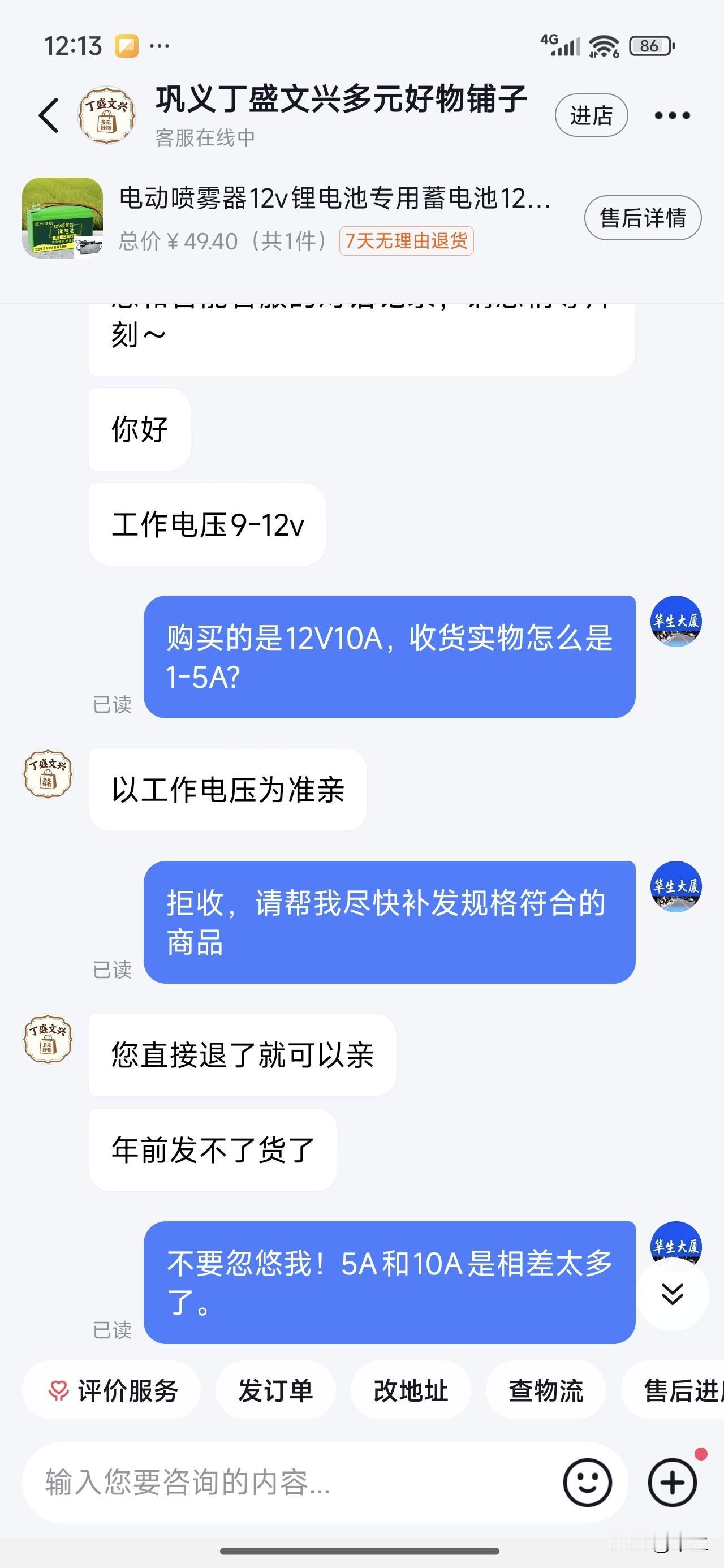 电池电商经营失诚信 果树开花结果之际,本想网购优质喷雾器电池为农事助力,却被“巩义丁盛文兴多元好物铺子”狠狠“坑”了一把,诚信经营在此黯然失色。 商家广告极具诱惑,“保质十年、满电打100桶水”,还有20元优惠券,让我毫不犹豫下单12V10A电池。然而,收到的却是12V1 - 5A的“李鬼”,反馈换货,客服竟以物流春节停运为由拒绝,还荒谬称12 V 1 - 5A就是12V10A,如果不要可以拒收。 商家这样神操作让我面临两个选择后果: 1.拒收后用旧器具一天要多充几次电。 2.当场签收:上机后有质量问题时再退货会因锂电池属危险品遭快递拒收,折腾后可能放弃;春节后再退时超退货期,只能自认倒霉;货不对版也因价格不高而妥协。 诚信是经营之本,遇到这种商家心里真郁闷。