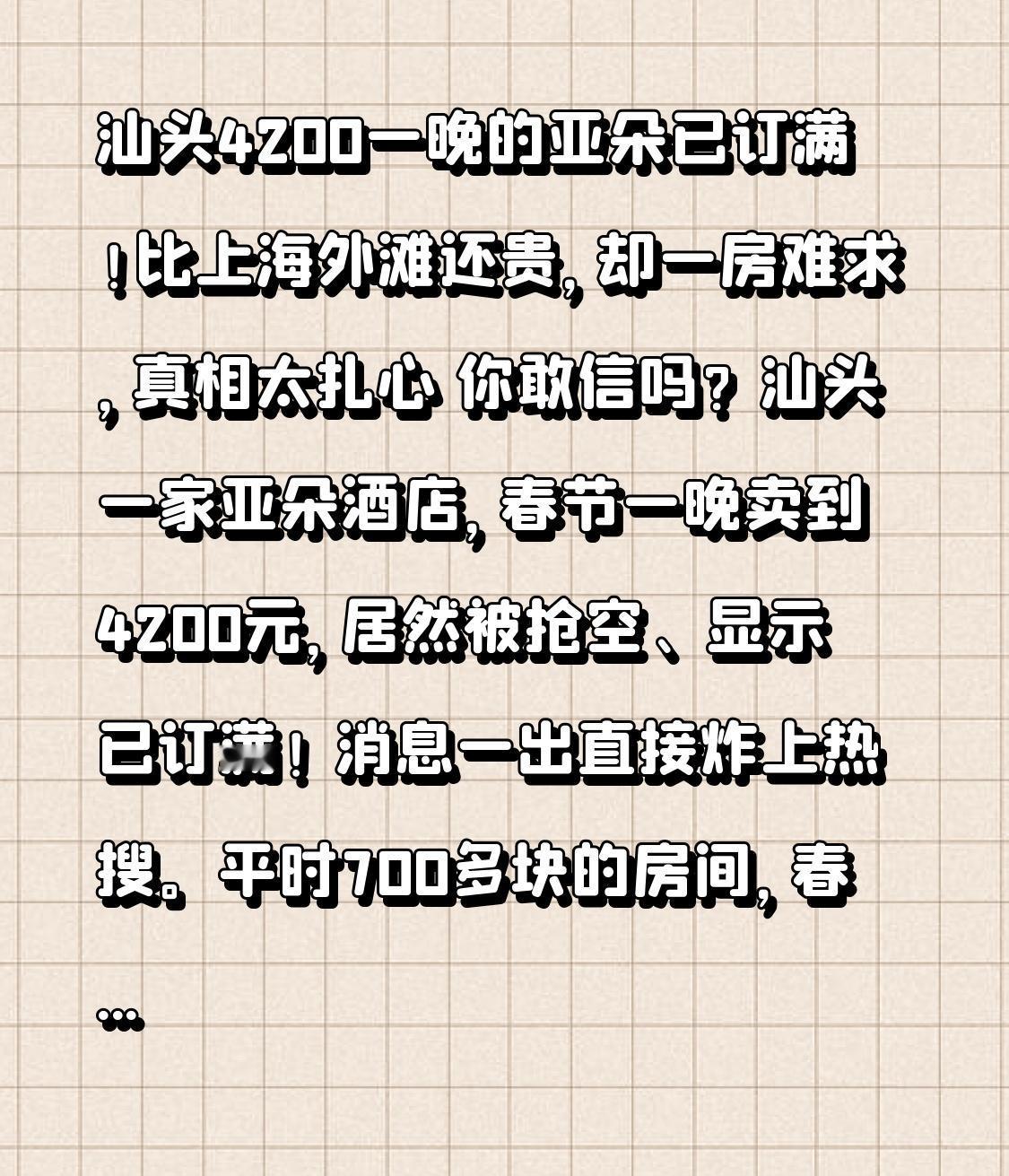 汕头4200一晚的亚朵已订满!比上海外滩还贵,却一房难求,真相太扎心 你敢信吗?汕头一家亚朵酒店,春节一晚卖到4200元,居然被抢空、显示已订满! 消息一出直接炸上热搜。平时700多块的房间,春节直接翻近5倍,价格超过上海外滩同档次酒店。网友直呼:汕头这是要赶超三亚了吗?吃顿潮汕火锅还没多少钱,住一晚酒店却要半个月工资! 很多人第一反应:疯了吧,谁会花4000多住连锁酒店?但现实狠狠打脸——不仅亚朵满房,周边汉庭、如家都飙到千元以上,核心地段甚至破2000,照样被订光。 转折点来了:这不是酒店单方面涨价,而是多重需求集中爆发。今年汕汕高铁全线开通,9天超长假期,加上汕头正月初二内海湾将上演11万发烟花+万架无人机表演,直接引爆全城热度。 作为著名侨乡,海外侨胞、外出乡贤扎堆返乡;游客冲着潮汕美食、年味、烟花秀蜂拥而至。预订量同比暴涨186%,客房数量却有限,供需严重失衡,价格自然一路飙升。 有人吐槽:吃得起生腌,住不起酒店;也有人无奈:一年回一次家,再贵也得住。更有网友调侃:以前去汕头是为了省钱吃好吃的,现在去汕头,先被酒店价格上一课。 当地监管部门已经紧急出手,发布价格告诫书,要求酒店合理定价、不得哄抬价格,让年味不被铜臭味冲淡。 其实大家生气的不是涨价,而是涨得太猛、太突然。一座以烟火气、性价比出圈的城市,突然因为酒店价格劝退普通人,难免让人失落。我们爱的汕头,是小吃遍地、年味十足、亲切温暖的小城,不是被炒成高不可攀的网红目的地。 火爆背后,是城市出圈的喜悦,也是文旅接待的考验。热度要留住,口碑更要守住。只有价格合理、服务跟上,汕头才能真正留住人心,而不是赚一波快钱就降温。 希望今年春节,汕头烟花璀璨、美食飘香,也希望每一个返乡人、游客,都能住得安心、玩得开心,不被高价酒店败了兴致。 你能接受春节酒店翻几倍?会为了烟花秀花4000多住汕头吗?评论区聊聊!