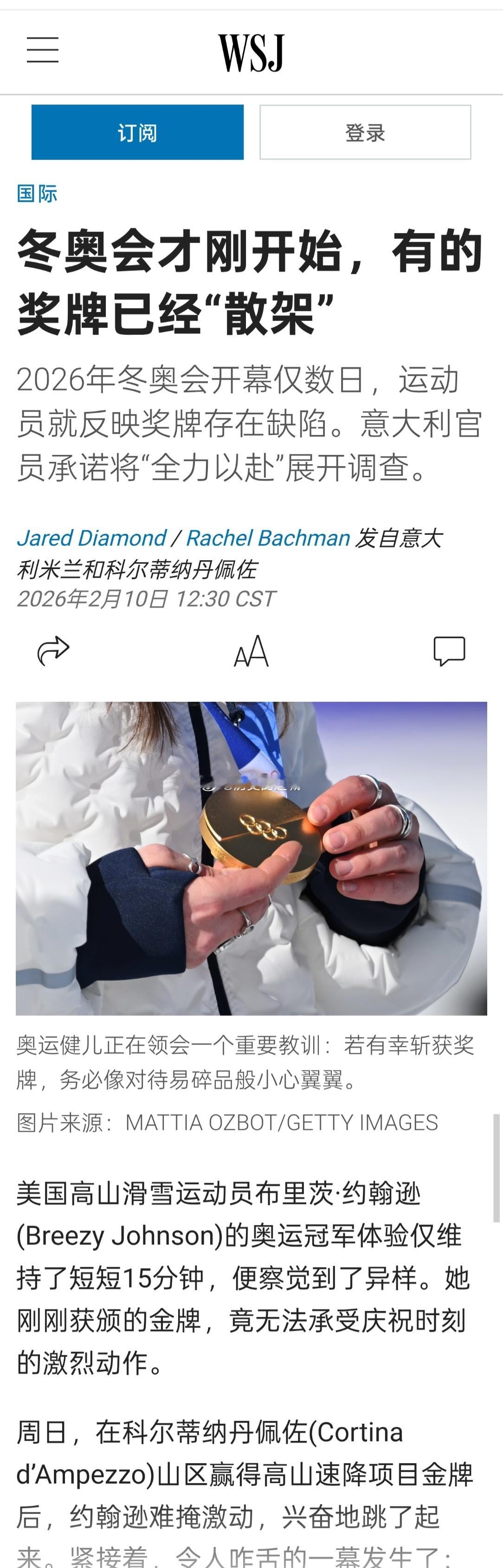 美国高山滑雪运动员布里茨·约翰逊在赢得高山速降项目金牌后,难掩激动,兴奋地跳了起来。紧接着,令人咋舌的一幕发生了:挂在她颈间的金牌从固定它的挂绳上脱离,导致她毕生梦寐以求的奖赏断成两截。2026年冬奥会开幕仅数日,就有运动员反映奖牌存在缺陷。意大利官员承诺将“全力以赴”展开调查。海外新鲜事