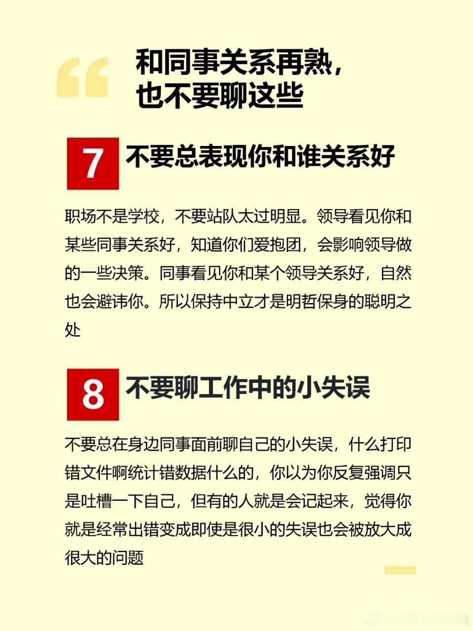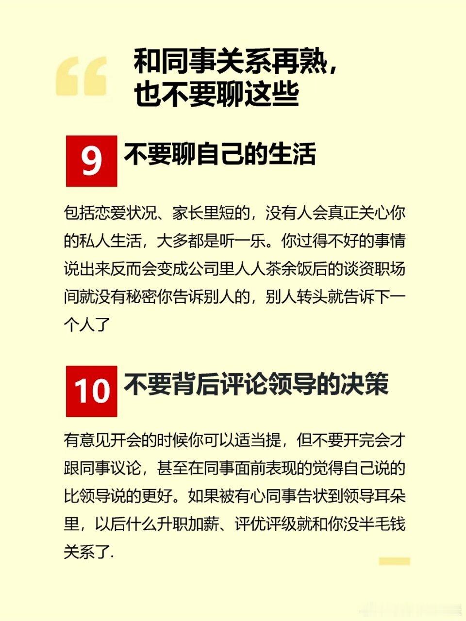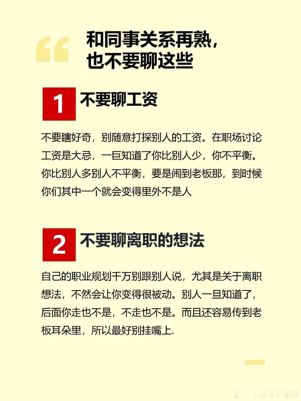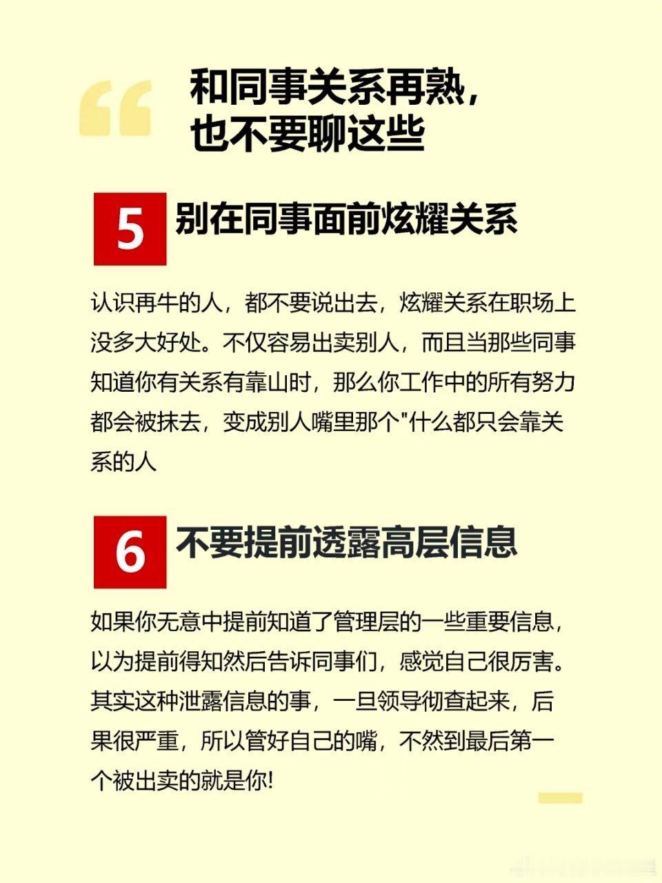 关系再好也不要说的事离职后才发现:和同事再熟也不要聊这些以前也觉得某些同事很聊得来,或许能成为关系很好的朋友,后面才发现同事之间本来就都只是表面的,职场里只有竞争关系罢了……