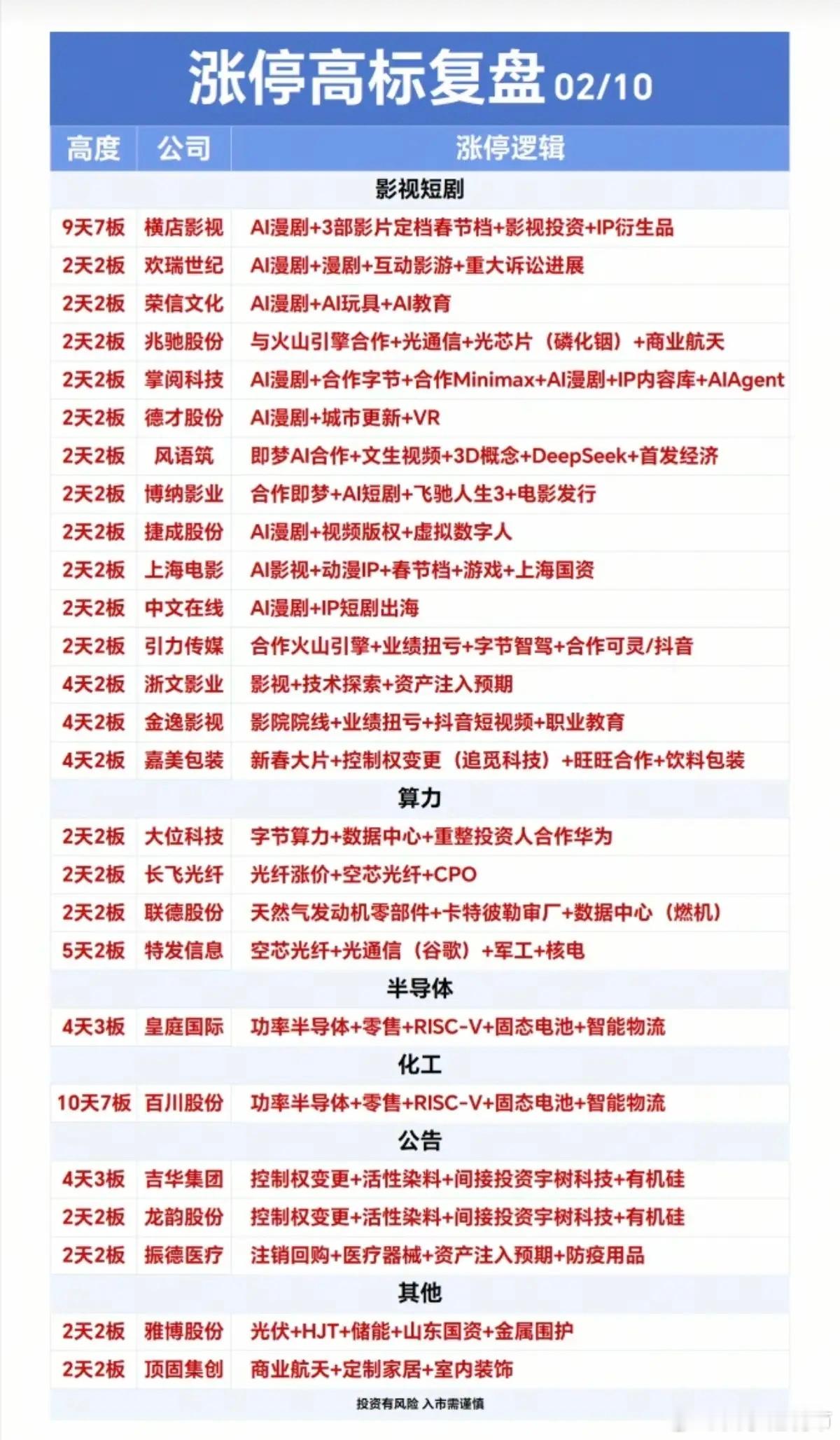 2.10周二 涨停板股票:题材+明细+高度