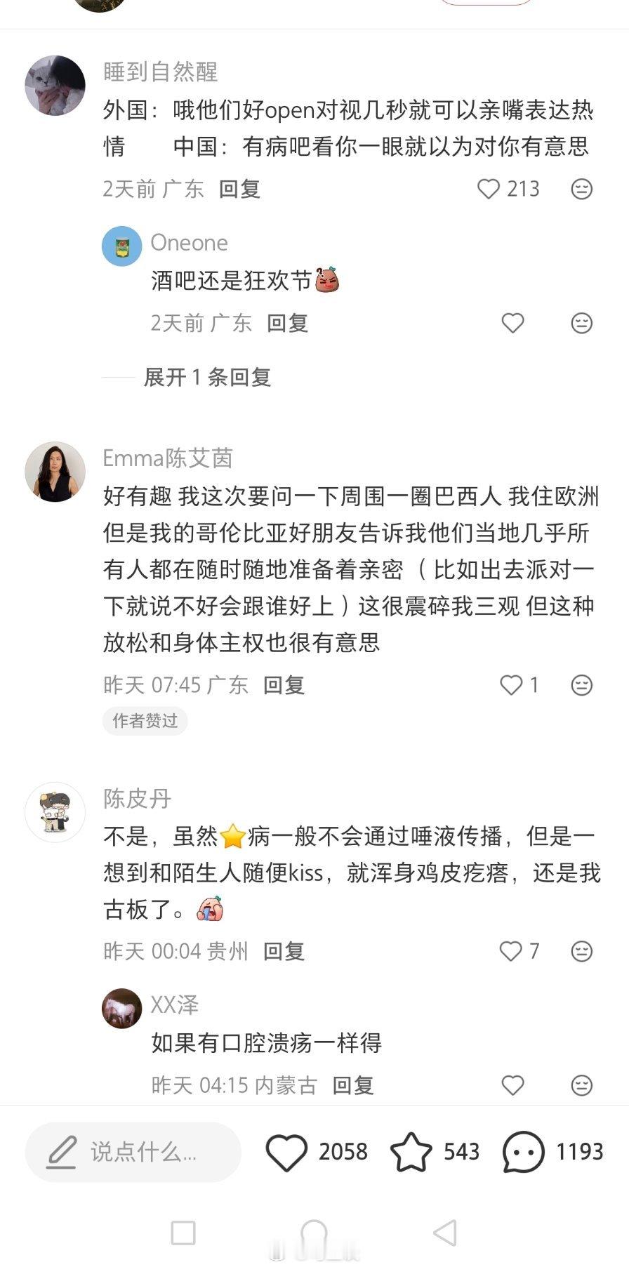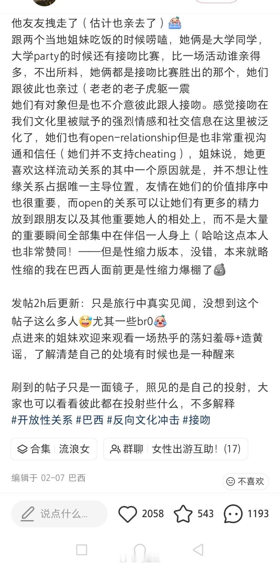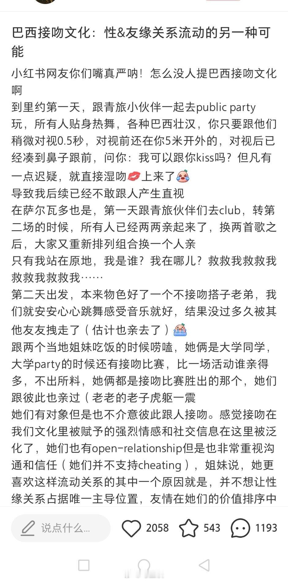 巴西接吻文化?女留学生称在巴西解除到一种新文化:在酒吧只要跟男人对视0.5秒,立马就给你来个深度湿吻,校园聚会搞接吻比赛。她说感觉很好,结果评论区一片哀嚎…