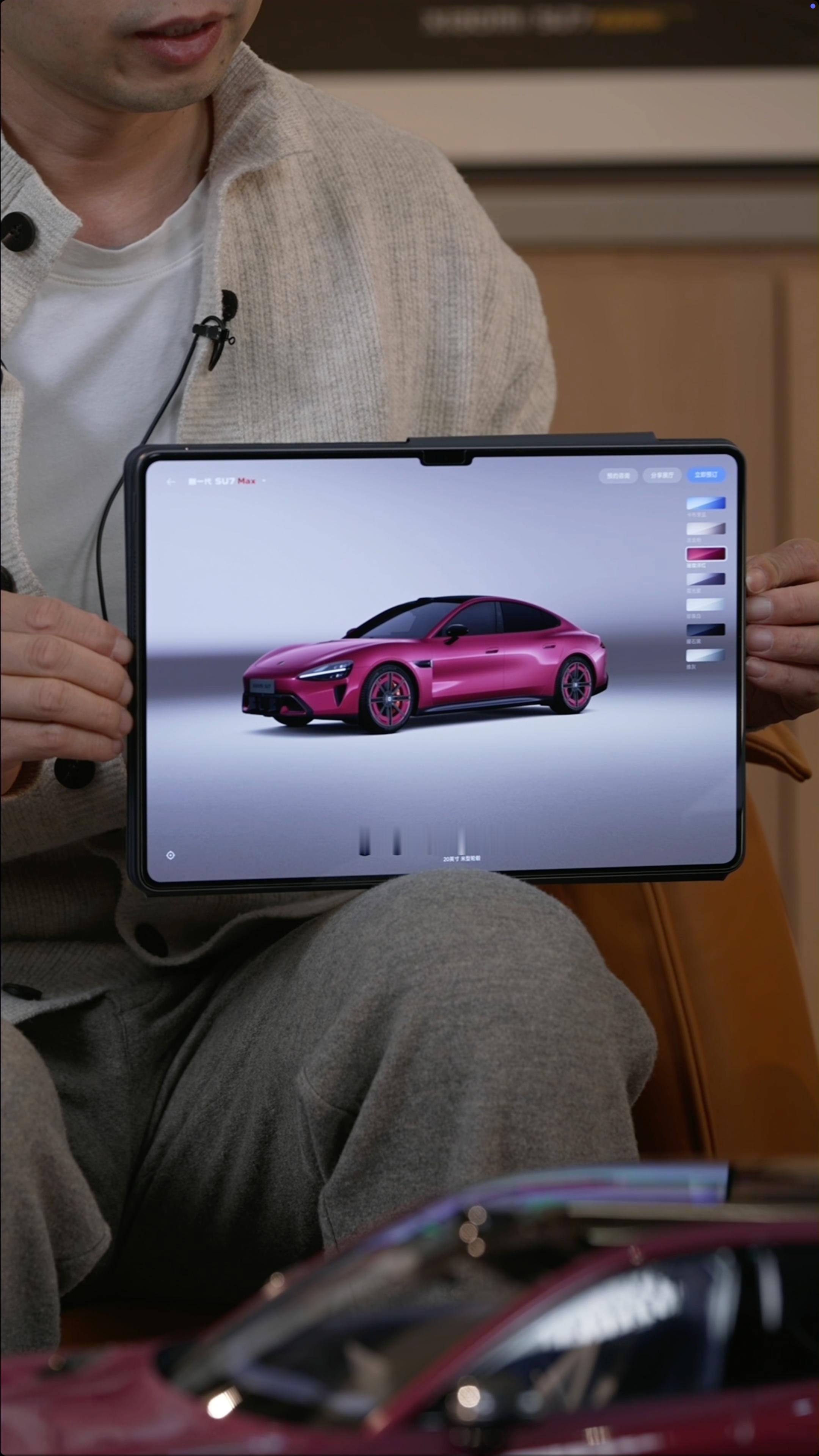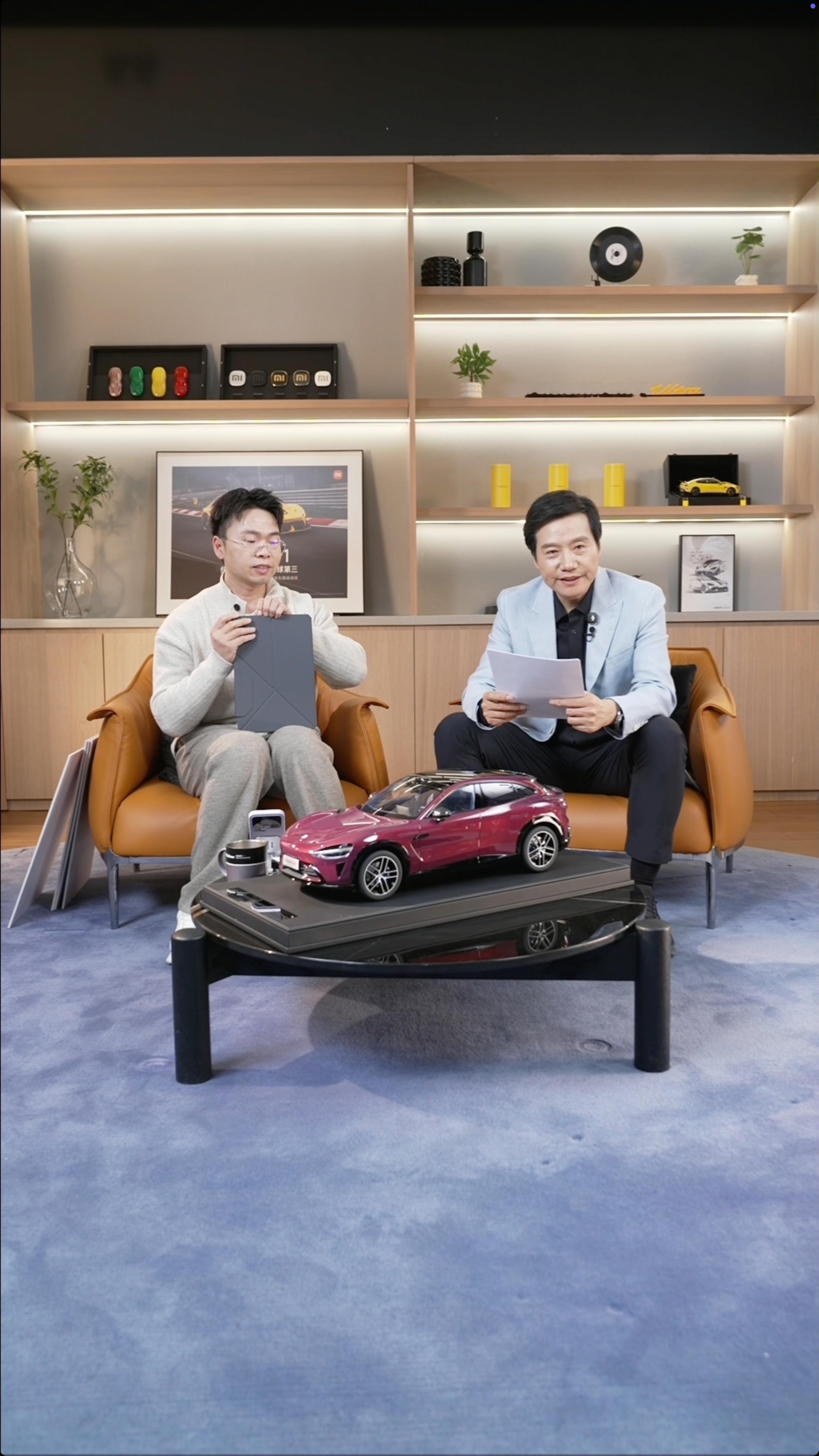 雷总与李肖爽面前展示的是 1:8 车模,由于样品少工艺高一台产品价格高达十几万;