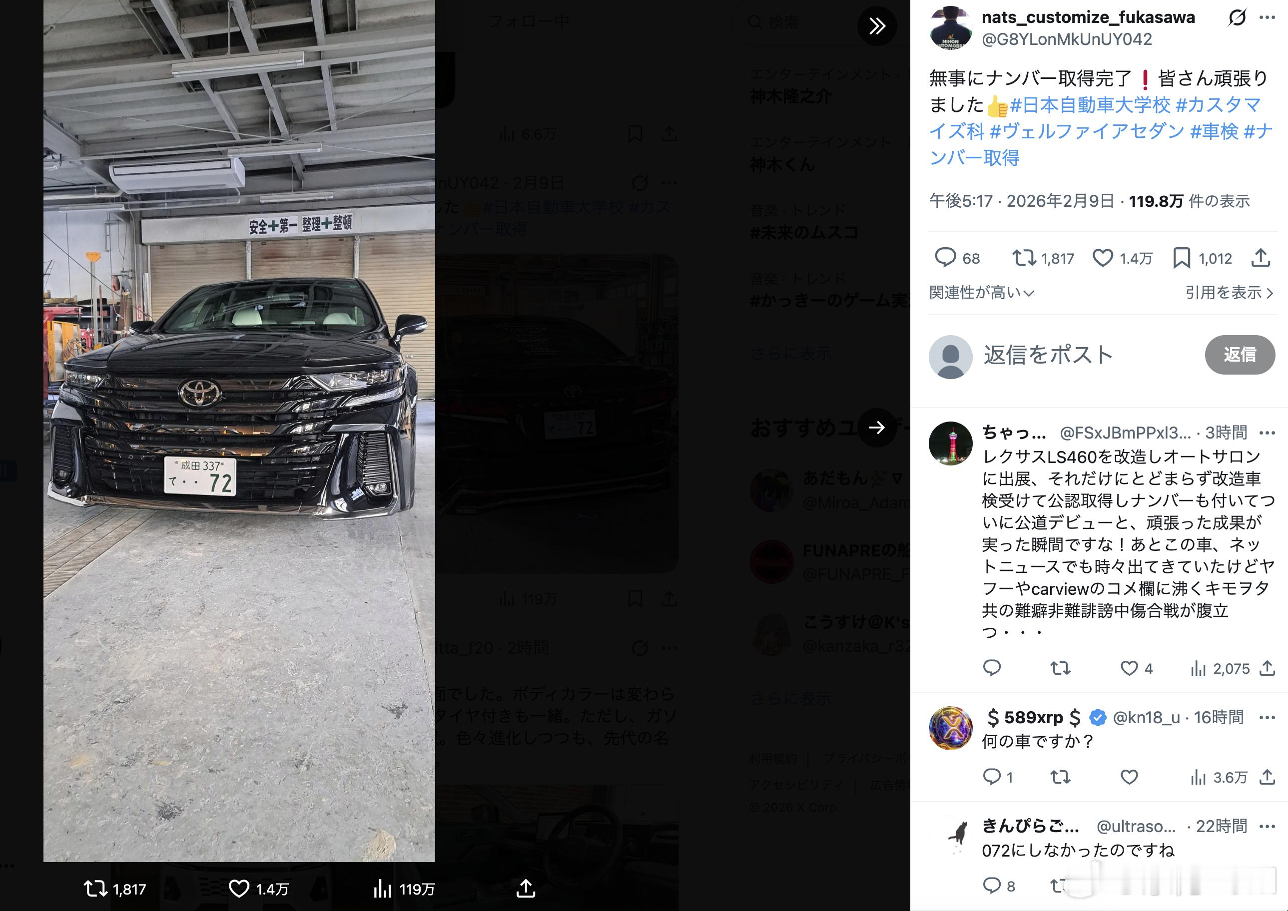 今年东京改装展上,日本自动车大学校的学生作品,雷克萨斯LS460改威尔法轿车,成功通过车检上牌了