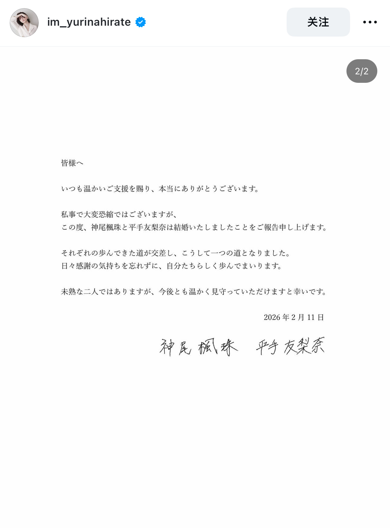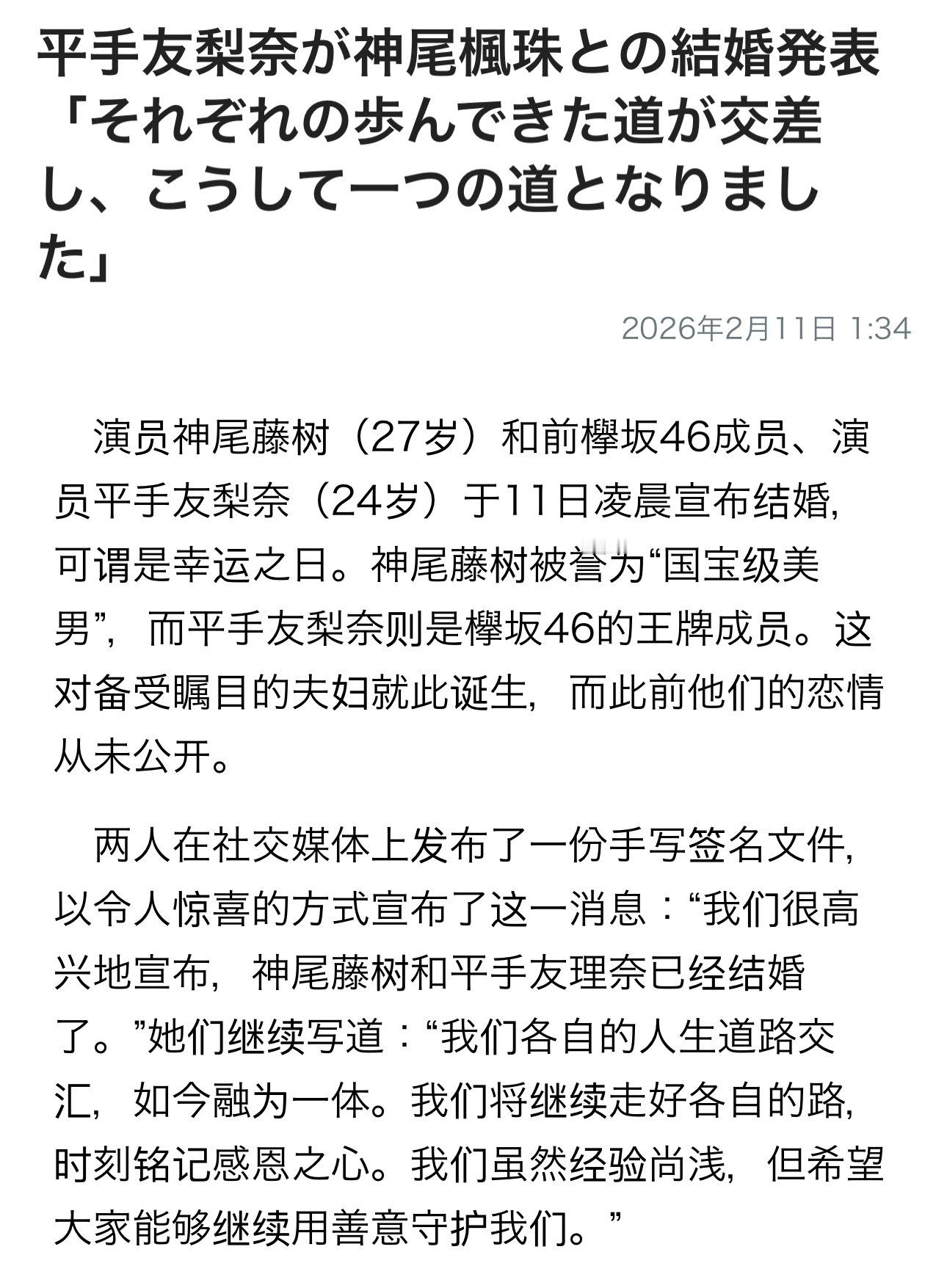 神尾枫珠与平手友梨奈官宣结婚omg日娱又来冲结婚kpi了……神尾枫珠与平手友梨奈今天凌晨官宣结婚🙉
