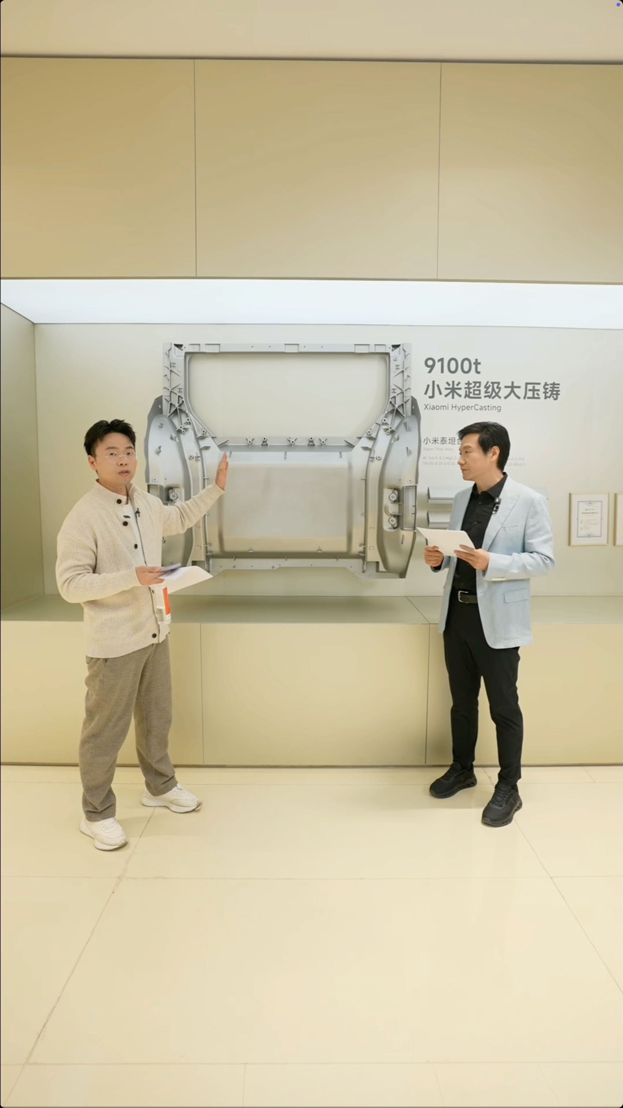 随后李肖爽还展示了 9100t 小米超级大压铸,使用小米自研泰坦合金,设备群与压铸岛也均为小米自研。9100t 的压铸机也让车身结构强度更高更安全。