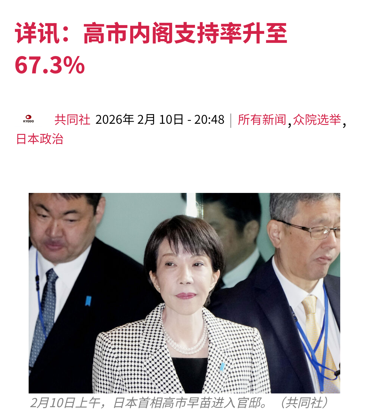 日本众议院选举结束后,共同社在日本全国范围内进行的电话调查显示,高市早苗内阁支持率已升至67.3%。