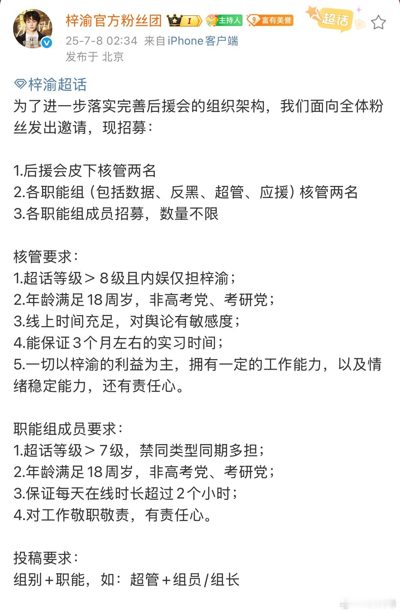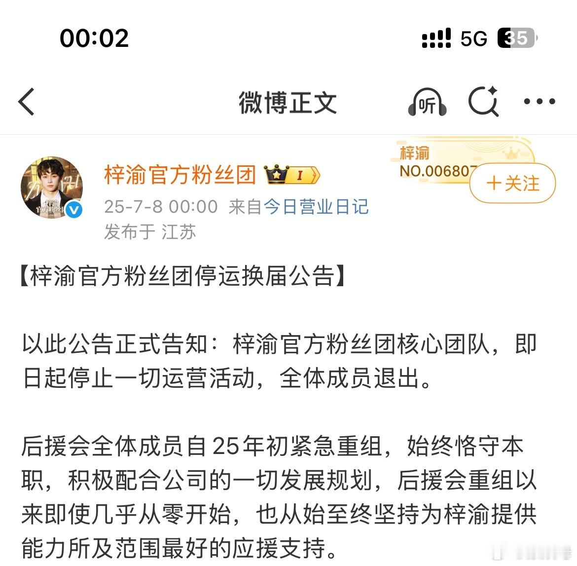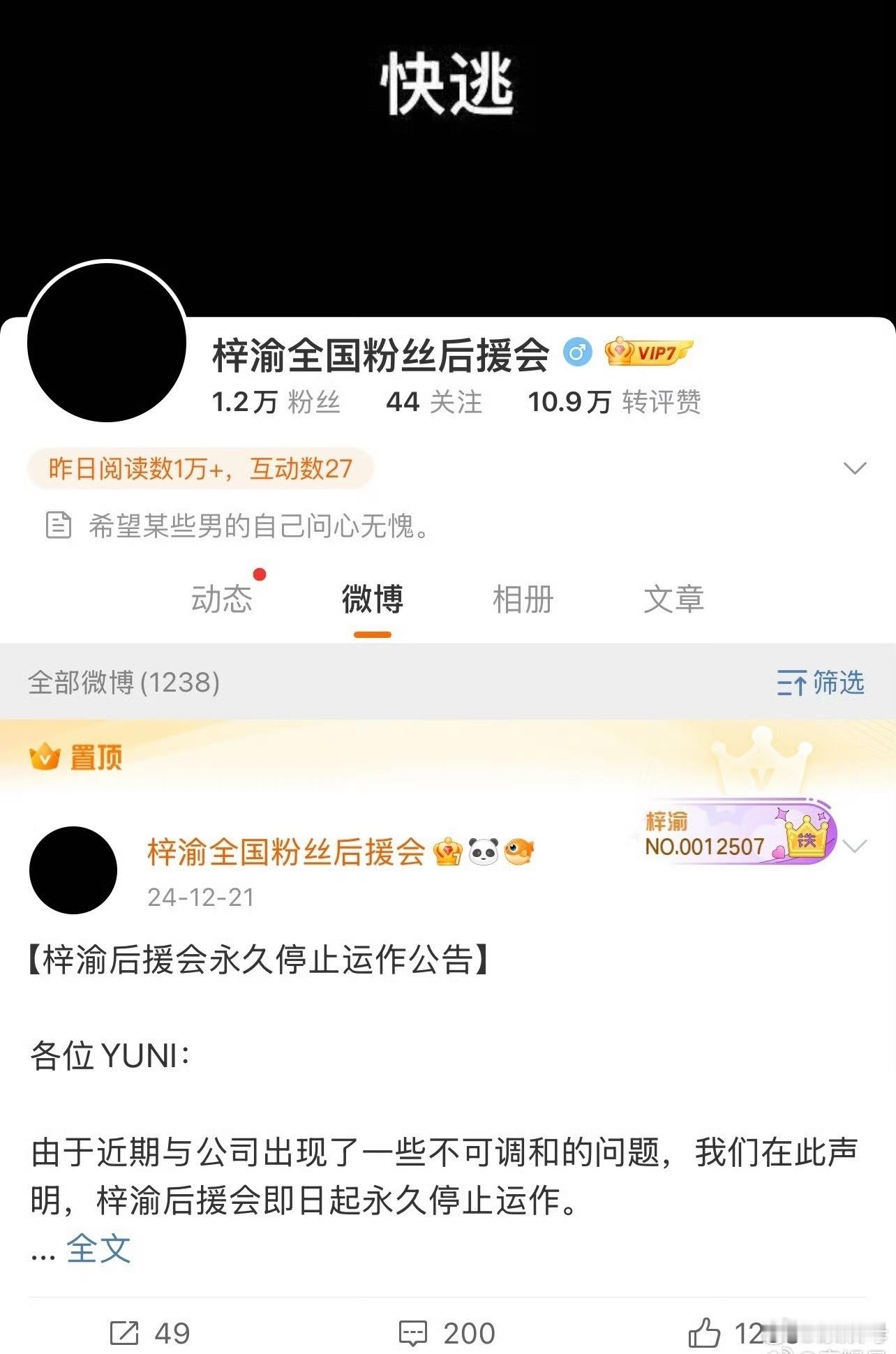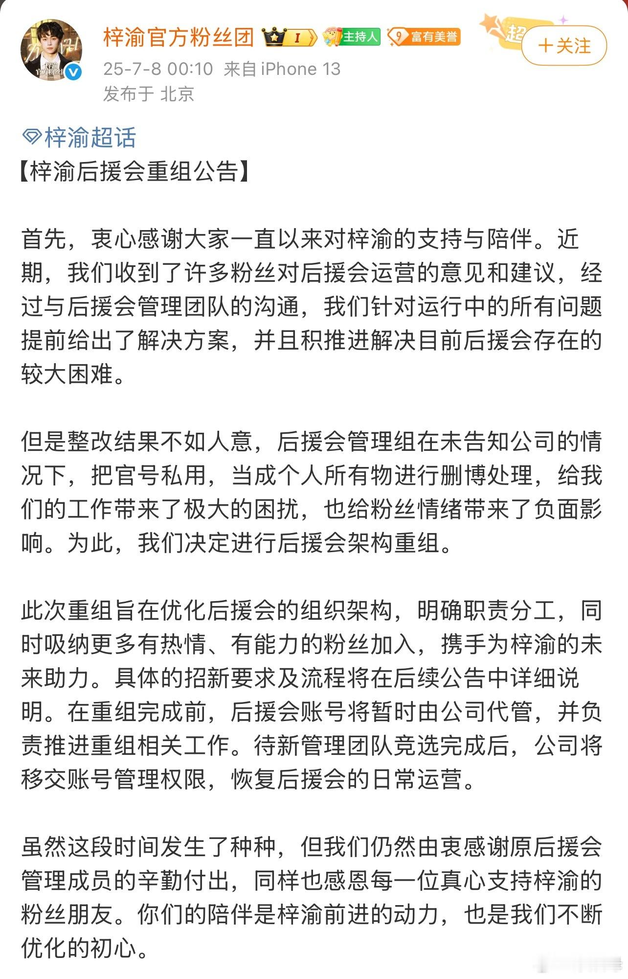 梓渝后援会 梓渝后援会梅开二度又全体跑路了……24年12月的时候后援会头像变成黑色直接跑路我能理解,25年都已经算爆火了粉丝团又直接发布了一个“梓渝官方粉丝团停运换届公告”全体退出跑路……疑似是因为不敢去ri 公司。还把超话设置满6级才能发帖,随后删除换届公告又发布了“梓渝后援会重组公告”。关键阶段后援会怎么能如此混乱…… 梓渝