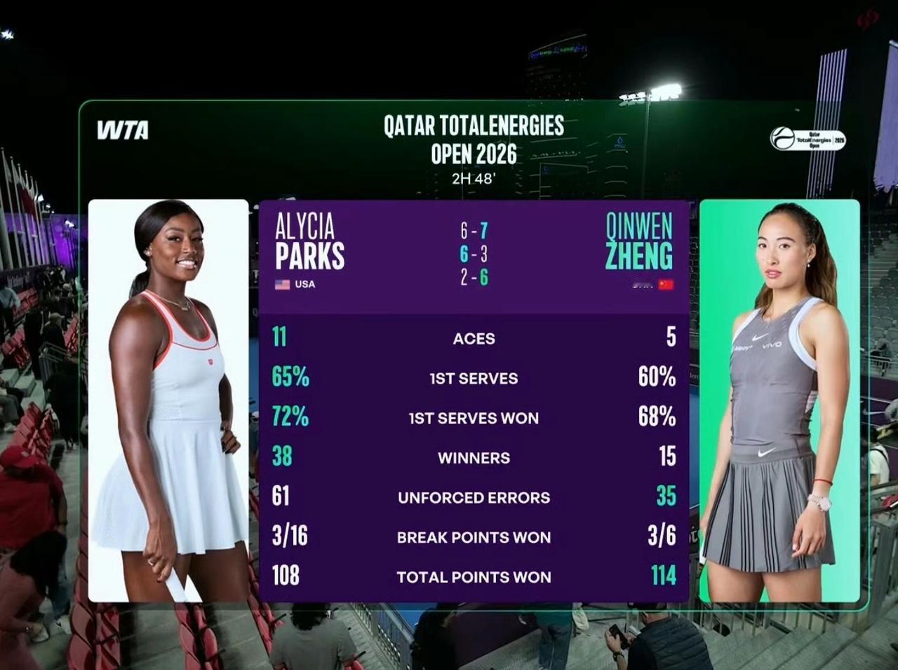 郑钦文善解人意知道大家想看球,非得来三盘,但是忘了国内有时差。 WTA1000多哈女单第二轮,郑钦文7-6(4)/3-6/6-2击败帕克斯闯进第三轮。 淘米收获120分、49250美元,即时排名No.23。 两人四手联弹奉献96记,帕克斯61记UE+钦文35记。 下一轮将战2号种子莱巴金娜,后者6-2/6-4淘汰中国金花王欣瑜。