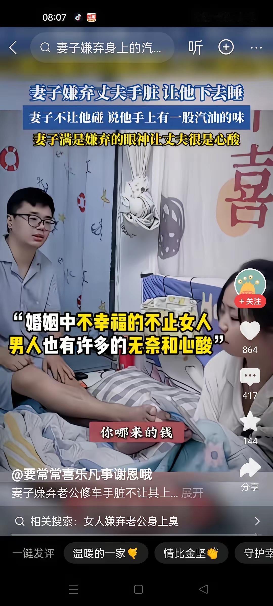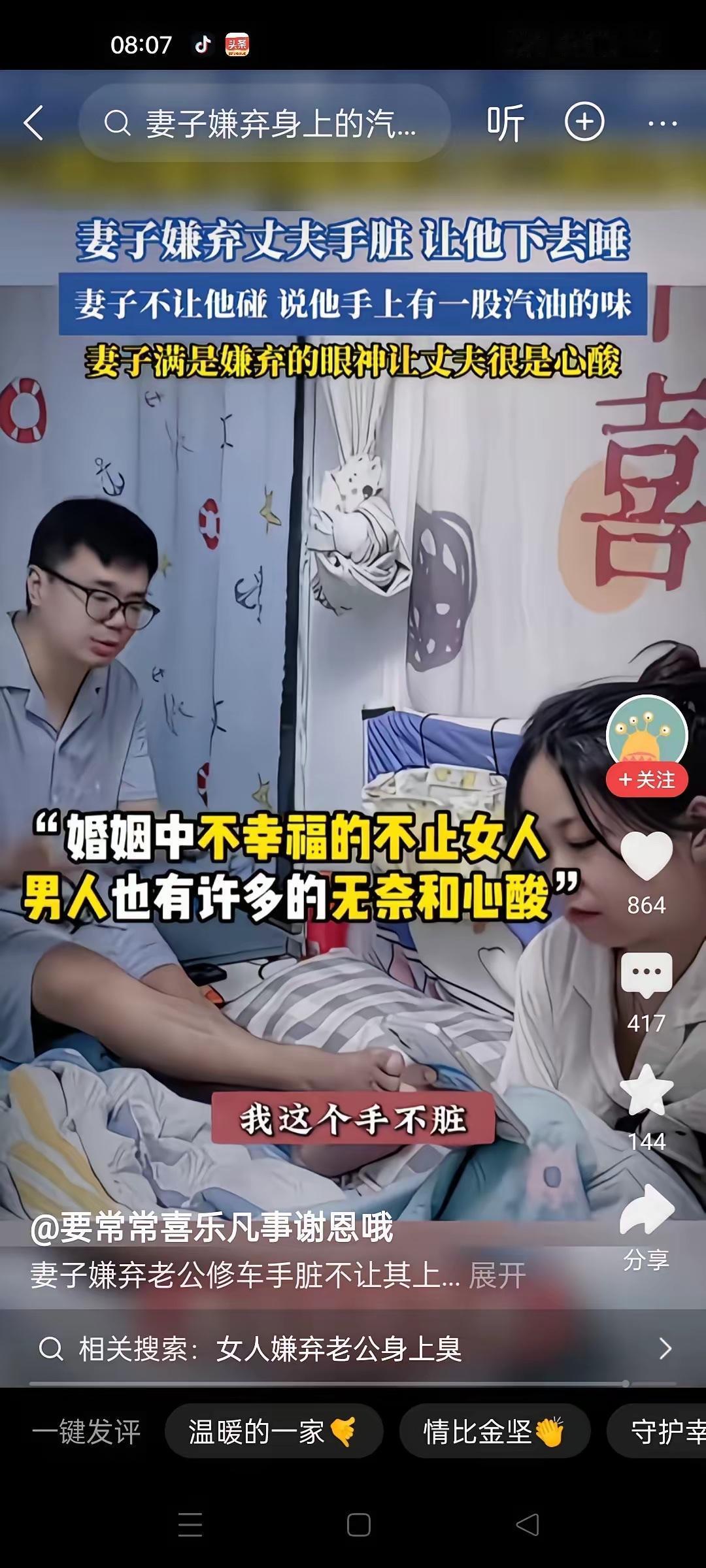 丈夫想跟老婆亲热一下,女人就是躲,嫌男人的手脏。男人感觉非常无奈,说出自己的肺腑之言。他说,我这个手是修车的手,上面都是机油,洗不干净的。我不是不洗,拿刷子刷,拿热水泡,我是洗不出来了。我抓你一下你就躲一下,说我这个手太脏。你这样说我,我不伤心吗?我就是挣这个辛苦钱。我的手不脏,你哪来的钱? 这双被妻子百般嫌弃的修车手,早被机油浸透了皮肤纹路,是无数底层劳动者养家糊口的真实模样。汽修行业的人都清楚,机油、润滑油一旦渗进手掌的细缝里,任凭热水浸泡、硬毛刷刷洗,都没法彻底恢复白净,这不是懒惰不讲卫生,是职业留下的无法抹去的印记。 男人的委屈藏在每一句哽咽的话里,他在外风吹日晒爬车底、拧螺丝,浑身沾满油污,拼尽全力挣的每一分钱,都悉数交给家里,撑起了两人的日常开销。他从未抱怨过工作的苦累,唯独被最亲近的人嫌弃手脏时,才彻底破了防。 妻子只看到了手上的油污,却看不见这双手背后的付出。是这双“脏手”换来了家里的米面粮油,换来了生活的安稳顺遂,她享受着丈夫辛苦打拼的成果,却转头嫌弃他谋生的工具,这份冷漠远比油污更刺人。 婚姻里最伤人的从来不是贫穷,而是视而不见的付出和理直气壮的嫌弃。职业从无高低贵贱,靠手艺吃饭、靠劳力养家的人,从来都值得被尊重。这双沾满机油的手,干着最脏的活,挣着最干净的钱,远比那些眼高手低、坐享其成的人高贵百倍。 男人的质问直白又戳心,他要的从不是多么富足的生活,只是伴侣的一点心疼和理解。多少夫妻能共苦却忘了同甘,忘了日子变好的底气,全来自那个默默扛下所有辛劳的人。 别用表面的干净,否定一个人全部的付出,别让最亲的人,因为你的嫌弃寒透了心。 各位读者你们怎么看?欢迎在评论区讨论。