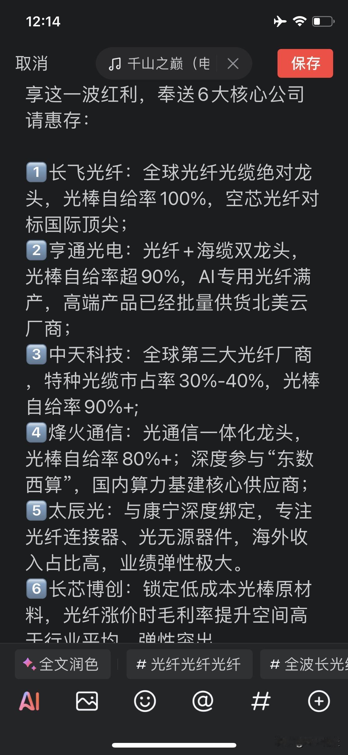 复盘光纤板块:2月1日,长飞光纤151元,10日211元,7个交易日涨幅41.82% 继续复盘,2月1日分享了6只光纤股,截止到10日,沪市大盘涨了0.25%,长飞光纤涨了41.82%,每股涨了60元,现在复盘如下: 股票/本月涨幅%/收盘价/涨幅% 1️⃣长飞光纤/41.7/211.48/10.00 2️⃣亨通光电/18.6/41.51/7.29 3️⃣中天科技/8.95/24.34/3.75 4️⃣烽火通信/10.76/43.86/2.38 5️⃣太辰光/9.99/137.46/-0.20 6️⃣长芯博创/1.9/165.08/-3.01 复盘的目的是检视自己的判断和操作,这6只股票,中间操作过烽火通信,微利走了;长飞光纤开始嫌价高没敢买,昨天174.65进,今日209.65出,盈利20个点。 经验和教训: 1️⃣买就龙头,只有龙头。如果能确定一只股票是板块龙头,要么不买这个板块,买就龙头,多贵都买。长飞光纤的涨幅远远超越大盘,超越板块,这就是龙头的魅力! 2️⃣发现可能走持续性的板块,一定要持续关注,千万不要被短时的调整洗出去。 3️⃣心动不如行动,发现好股,该出手时就出手。 10日盘后,长飞光纤出了异常波动公告,看今日市场怎么解读,长飞光纤怎么走。 免责声明:个人观点,不构成投资建议,股市有风险,投资需谨慎。