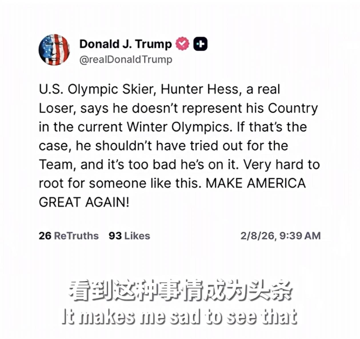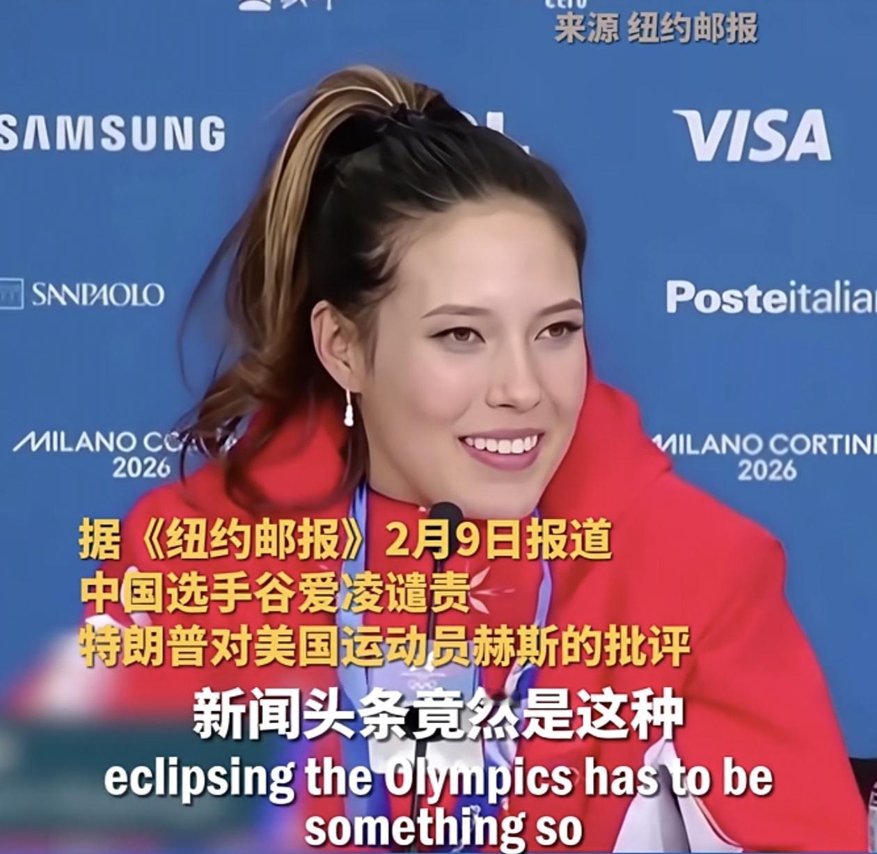 谷爱凌批评特朗普的政治表演🎭米兰冬奥会的雪道上,谷爱凌刚刚完成了女子坡面障碍技巧的比赛,拿到了一枚银牌。但让她登上全球头条的,不是奖牌,而是她对特朗普的一句批评。 事情的起因是美国滑雪运动员亨特·赫斯。在赛前发布会上,他坦诚地表示,代表美国参赛让自己“情绪复杂”,因为“身披国旗,并不意味着我代表美国正在发生的一切”。这番话,是对当下美国社会撕裂的真实写照。 然而,特朗普却在社交媒体上直接将赫斯骂作“真正的失败者”,还说“很难为这样的人加油”。这种将运动员的个人表达粗暴地政治化,甚至进行人身攻击的做法,立刻引发了争议。 谷爱凌在赛后的新闻发布会上,没有回避这个问题。她平静却坚定地说:“很遗憾,盖过奥运光芒的头条新闻,竟然是和奥运精神如此无关的东西。这与奥运应有的样子完全背道而驰。” 她还补充道:“体育运动的意义就在于将人们团结在一起。它是为数不多的共通语言之一,它连接着人类的身体、精神、竞争精神,以及打破纪录的能力。” 这番话,不仅是对特朗普的回应,更是对当下体育政治化的有力反击。 特朗普的愤怒,本质上是一种政治表演。他将运动员的个人思考,扭曲成“不爱国”的罪状,试图用民粹主义的口号绑架体育。而谷爱凌的回应,则回归了体育的本质——奥运五环的意义,从来不是代表某个政权,而是代表全人类对卓越、团结和包容的追求。 作为曾经也因国籍选择而被卷入舆论漩涡的运动员,谷爱凌比任何人都清楚,当政治凌驾于体育之上时,运动员会承受怎样的压力。她那句“作为曾经被波及其中的人,我为这些运动员感到难过”,道尽了所有在政治风暴中挣扎的运动员的心声。 赫斯后来在社交媒体上回应,重申了自己对国家的爱。这恰恰证明,他的言论并非“叛国”,而是一个公民对国家的深沉思考。而特朗普的“Loser”标签,不过是他转移国内矛盾、煽动对立的惯用伎俩。 当谷爱凌站在雪道上,她代表的是中国;当她说出这番话时,她代表的是所有热爱体育的人。她用自己的声音提醒世界:奥运精神,不该被政客消费。