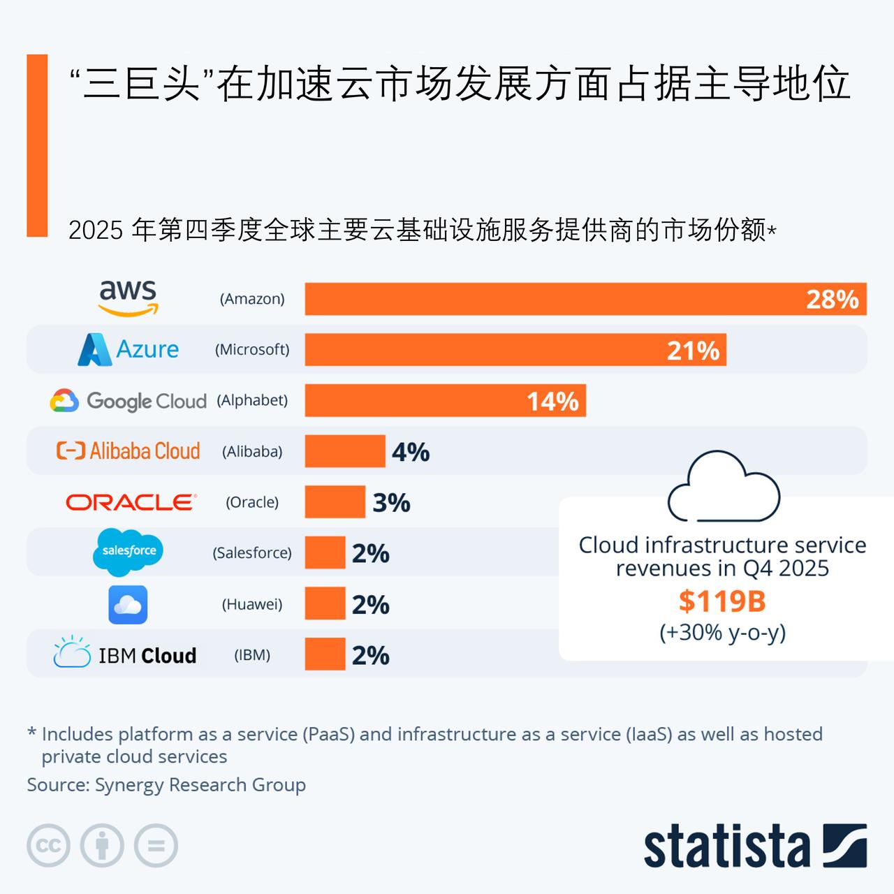 2025 年全球云市场规模将增长至 4190 亿美元,“三巨头”仍占据主导地位 在过去几年里,随着越来越多的 IT 服务被转移到云端,云基础设施服务的市场规模大幅增长。据Synergy研究集团称,去年云基础设施服务的收入增长了 900 亿美元,达到 4190 亿美元,自 2017 年以来增长了近九倍。尽管该市场的增长在 2023 年逐渐自然地放缓至略低于 20%的水平,但生成式人工智能的兴起以及相应的云计算需求导致 2024 年和 2025 年的增长再次加速——考虑到市场的规模,这实在令人瞩目。2025年,全球云市场以 27%的增速增长,这是自 2022 年以来的最高增速。 “GenAl 无疑极大地推动了云市场的发展,” Synergy研究集团首席分析师约翰·丁斯代尔在一份声明中表示。“自 2022 年以来,专门针对人工智能的服务占据了大部分的增长份额,但人工智能技术也提升了云服务的整体范畴,从而推动了整体的收入增长。”丁斯代尔补充道。 在确立了自己在云基础设施市场的领先地位之后,亚马逊网络服务(AWS)依然遥遥领先。据Synergy研究集团的估计,亚马逊在 2025 年第四季度在全球云基础设施市场的份额达到了 28%,高于微软的 Azure 平台的 21%和谷歌云的 14%。这“三大”超大规模云计算公司共同占据了不断增长的云市场的逾 60%份额,而其余竞争对手的市场份额则处于个位数的低位。 对于亚马逊而言,AWS 是其盈利能力的关键驱动因素,也是其低利润核心零售业务的完美补充。2025 年,亚马逊的云业务占公司总销售额的 18%,但占其营业利润的 57%。AWS 每年的营收接近 1300 亿美元,营业利润达 450 亿美元,是亚马逊成功的关键因素,有时却被人们所忽视。 在 2025 年第四季度,全球云基础设施服务支出较 2024 年同期增长了 290 亿美元,增幅达 30%,截至 12 月 31 日的三个月内总支出达到 1190 亿美元。2025 年全年,云基础设施服务收入首次超过 4000 亿美元,这也就解释了为何该市场竞争如此激烈。尽管规模庞大,但云市场仍保持着强劲的增长态势,过去九个季度中,年增长率均在不断加快。得益于人工智能热潮以及随之而来的计算需求,上一季度的增长率是三年多来最高的。 “我们曾表示,第三季度的市场数据表现十分出色,但与第四季度相比则相形见绌。像这样的增长速度自 2022 年初以来就未曾出现过,当时市场的规模还不到如今的一半。” 丁斯代尔说道。