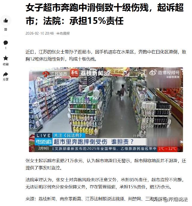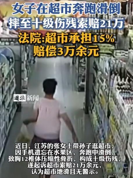 江苏,张大妈带小孙子逛超市,在水果区挑拣时把手机落下,结账发现手机不见,她把孩子一放,就往水果区狂奔,途中经过日化区,因跑得太急没留意脚下,不慎滑倒,被查出胸12椎体压缩性骨折,构成十级伤残。张大妈觉得超市地面滑且无警示标识,要求超市赔偿21万,最终的判决结果令人意外。 本信息来源于:逐浪新闻、半岛晨报的报道 事发当天,张大妈带着小孙子去超市采购,想着给家里添点新鲜玩意。 一进超市,张大妈拉着小孙子先来到了水果区,挑着挑着,张大妈就顺手把手机搁在了旁边的货架上。她想着等挑完水果再去拿手机,反正也不会跑。 可挑完水果,张大妈又带着小孙子在超市里转了转,买了些日用品,等来到结账的地方,张大妈一摸口袋,坏了!手机不见了! 这手机对她来说可重要了,里面存着家人的照片,还绑着银行卡,这要是丢了,麻烦可大了去了。 张大妈也顾不上小孙子了,把他往旁边一撂,撒腿就往水果区跑,跑到日化区的时候,意外发生了。 张大妈脚下一滑,摔在了地上,这一摔,可把她摔惨了,感觉骨头都要散架了,她想爬起来,可试了几次都没成功。 最终经过检查,张大妈被诊断为胸12椎体压缩性骨折,还构成了十级伤残。 张大妈躺在病床上觉得,自己之所以会摔倒,就是因为超市的地面太滑了,而且还没有警示标识。要是超市能提前做好防范措施,她也不会遭这份罪。 于是,张大妈决定起诉超市,并要求超市赔偿她21万。 超市接到传票后,他们指出超市的地面是做过防滑处理的,而且平时也经常打扫,根本不存在地面滑的问题。张大妈之所以会摔倒,完全是因为她自己跑得太急了,没注意脚下。 超市这边呢,接到起诉后觉得挺冤枉。他们说地面是防滑的,平时也经常打扫,不可能存在地面滑的情况。而且张大妈是自己跑太快,没注意脚下才摔倒的,跟超市没关系。 审理时,法院还查看了超市监控录像,发现张大妈摔倒时地面确实没有明显水渍或其他异物。 但也注意到超市日化区货架摆放比较密集,通道相对狭窄,张大妈在匆忙奔跑过程中,可能因为视线受阻或注意力不集中而摔倒。 从法律角度看,根据《民法典》规定,宾馆、商场、银行、车站、机场、体育场馆、娱乐场所等经营场所、公共场所的经营者、管理者或者群众性活动的组织者,未尽到安全保障义务,造成他人损害的,应当承担侵权责任。 超市作为经营场所,有义务保障顾客在超市内的人身安全。如果超市没有尽到这些义务,导致顾客受伤,就要承担相应赔偿责任。 本案中,超市地面并没有明显水渍或异物,也设置了基本防滑措施。张大妈摔倒更多是因为自己匆忙奔跑、注意力不集中导致。 根据民法典规定,被侵权人对同一损害的发生或者扩大有过错的,可以减轻侵权人的责任。 法院在审理过程中发现,虽然超市地面在一定程度上可能存在一些湿滑的情况,但张大妈作为成年人,在奔跑过程中没有尽到合理的注意义务,这才是导致她摔倒的主要原因。 所以,张大妈自身存在较大过错,应承担主要责任。超市虽然尽到一定安全保障义务,但货架摆放和通道设置存在一定不合理之处,也应承担部分责任。 最终,法院判决张大妈自己担85%责任,超市担15%,赔偿3万多。 对于这个判决结果,有人觉得判得公平合理,张大妈自己不小心,就该承担主要责任,也有人觉得超市多少还是有点责任,毕竟地面湿滑是个客观因素。 不管怎么说,对张大妈来说,这伤痛和损失,可不是这3万多块钱就能弥补的。 您对这件事有什么看法呢?是觉得张大妈自己太大意,还是觉得超市应该承担更多责任呢?