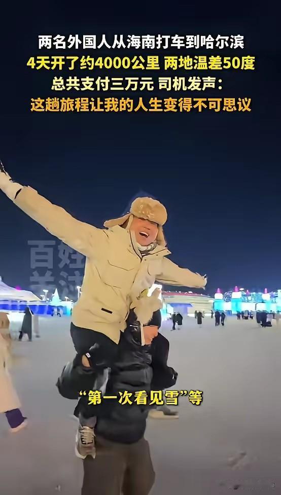 “这就是有钱任性!”近日,海南,两名外国男子,为了体验中国的风土人情,竟在软件约了个出租车司机,想要从海南开到哈尔滨,这把司机吓得不轻,不过还是同意了,就这样,三人边开边玩,最终在4天后,到达了哈尔滨!司机:我的人生变得不可思议! 说实话,刷到这个视频的时候,不少人的第一反应都是“这俩老外是真敢玩”。但仔细咂摸咂摸,又觉得这事挺有意思的。你想啊,从海南到哈尔滨,直线距离都快4000公里了,正常坐飞机也就五六个小时,他们倒好,花了3万块钱包了个出租车,硬生生开了4天。这钱要是给普通人,能在三亚住半个月海景房,还能顿顿吃海鲜。可人家呢,就图个“在路上”的感觉。 有网友特意去翻了翻司机的账号,他叫小李,是个土生土长的海南人。他说,当时接到订单的时候,手机都差点掉地上。“从海南到哈尔滨?这单我跑一趟,顶我大半年的收入了。”他一开始还以为是恶作剧,反复跟老外确认了好几次,直到对方把定金转过来,他才敢相信这是真的。 这一路上,他们可没闲着。小李说,这俩老外对啥都好奇。路过桂林的时候,他们看到喀斯特地貌,直接让车停在路边,对着山水拍了一个多小时,嘴里不停念叨“amazing”。到了武汉,他们非要去吃热干面,结果被辣得直吐舌头,还一个劲说“好吃”。最让小李印象深的是到了东北,刚一下车,那俩老外就像疯了一样,抓起地上的雪就往对方身上扔,其中一个来自热带国家的小伙子,长这么大还是第一次看见雪,直接在雪地里打了好几个滚。 有人说,这就是典型的“有钱任性”,3万块钱干点啥不好,非要遭这个罪。也有人说,这才是旅行的意义,不是走马观花打卡景点,而是真正融入当地的生活。这事没那么非黑即白。你看,小李师傅,一个普通的出租车司机,因为这趟旅程,不仅赚了钱,还成了网红,现在每天都有粉丝给他发私信,问他下次还带不带团。那俩老外呢,他们用一种最“笨”的方式,感受到了中国从南到北的巨大差异,这种体验,是任何旅游攻略都给不了的。 当然,也有人提出了质疑。比如,这种跨城包车的行为,到底合不合规?出租车的经营范围一般都在本地,这么长途的行驶,安全问题怎么保障?还有,3万块钱的费用,到底是怎么算出来的?是包含了油费、过路费,还是单纯的劳务费?这些问题,目前还没有一个明确的答案。 这事最有意思的地方,不是它有多离谱,而是它让我们看到了一种新的可能性。当很多人还在纠结“旅行的意义是什么”的时候,人家已经用行动给出了答案。旅行,从来都不是为了发朋友圈炫耀,而是为了打破自己的认知边界,去体验不一样的人生。 你怎么看这事?是觉得这俩老外太浪费,还是羡慕他们能有这样的勇气?或者,你也有过类似“疯狂”的旅行经历?评论区聊聊。 信息来源:《两名外国人从海南打车到哈尔滨,4天开了约4000公里,司机发声:这趟旅程让我的人生变得不可思议》百姓关注