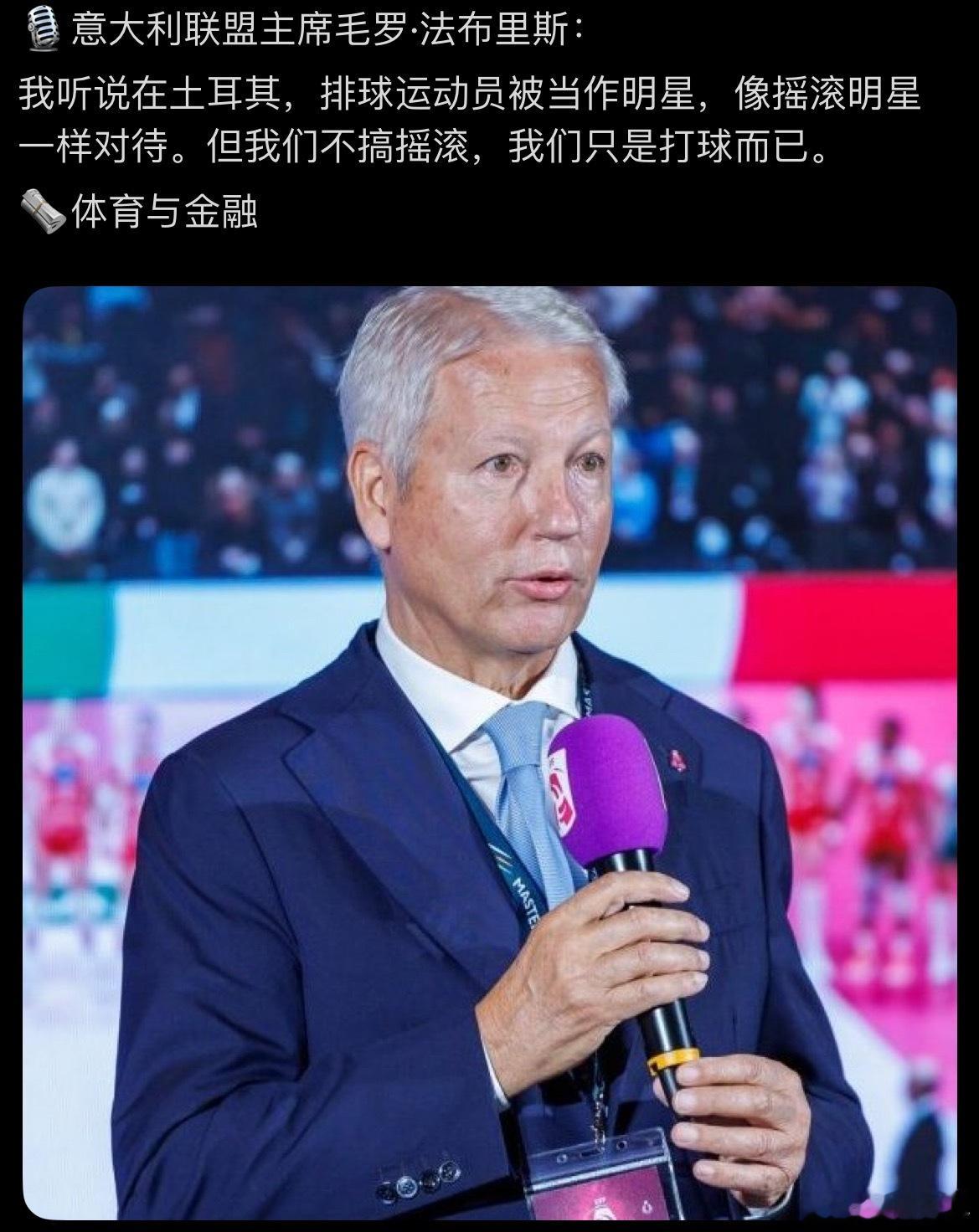 【意甲主席谈论土耳其球员像摇滚明星】意甲主席法布里斯:我听说土耳其把排球运动员当时明星,像摇滚明星那样对待,我们不搞摇滚,我们就是纯粹打球的!你怎么看?