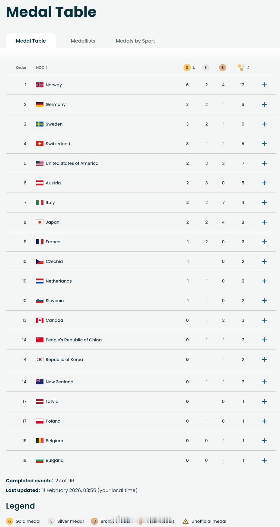 【冬奥最新奖牌榜:挪威独领风骚 中国暂列14】冬奥会 2月10日,米兰冬奥会第四比赛日结束。挪威在连夺三金后以6金2银4铜在奖牌榜上遥遥领先,德国、瑞典和瑞士各获3金排名2-4位,美国、奥地利、意大利和日本2金排名5-8位,另有法国、捷克、荷兰和斯洛文尼亚收获1金。中国队以1银1铜与韩国并列第14位。