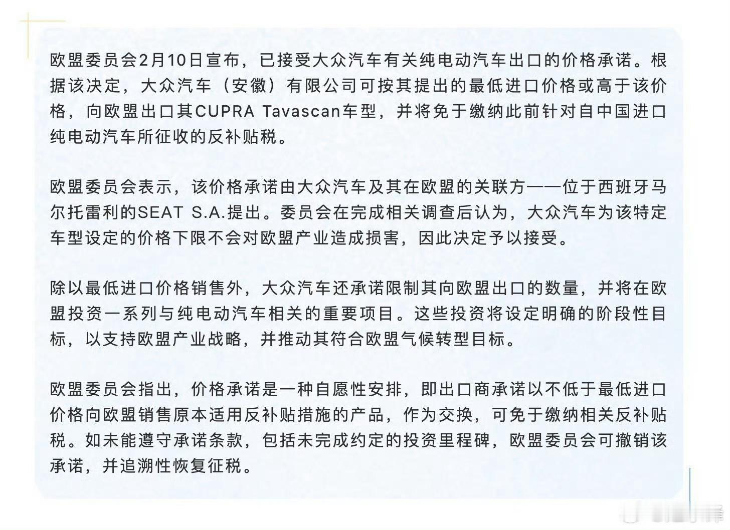 欧盟委员会2月10日宣布,已接受大众汽车有关纯电动汽车出口的价格承诺。根据决定,大众汽车(安徽)有限公司可按其提出的最低进口价格或高于该价格,向欧盟出口其CUPRA Tavascan车型,并将免于缴纳此前针对自中国进口纯电动汽车所征收的反补贴税。