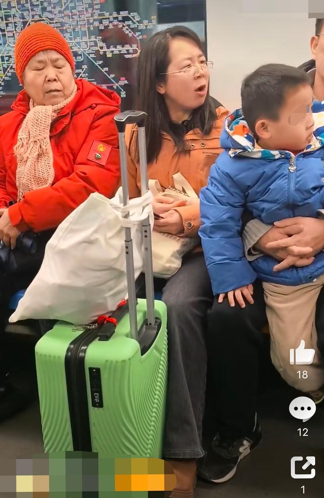北京,一地铁车厢内,疑似这个老太太让3岁小孩让座,结果这一家没让,然后这个老太太