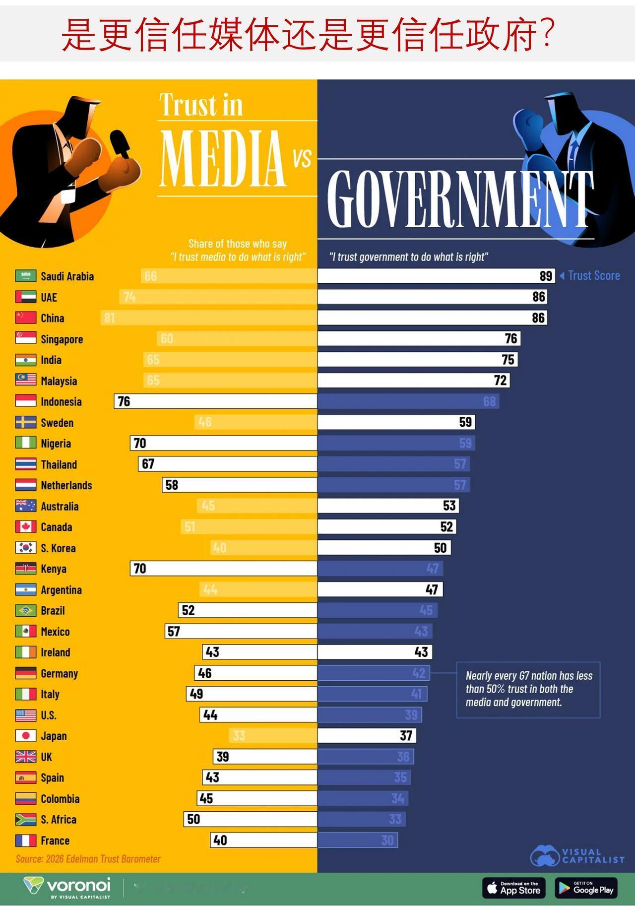 人们是更信任媒体还是更信任政府? 对机构的信任决定了社会的运行方式——从民众是否遵循公共卫生指南,到他们是否相信选举结果。然而,不同国家对政府和媒体的信任程度却存在显著差异。 下面图表展示了不同国家近 34,000 人的投票结果,据此可以看出人们更信任媒体还是更信任政府。这些数据来自 2026 年爱德曼信任度调查报告。 受访者被问及他们是否信任政府和媒体能够“做正确的事”。 ——中东和亚洲地区的政府高度信任度 像沙特阿拉伯、阿联酋、中国和新加坡这样的国家,民众对政府的信任程度高于对媒体的信任程度。 沙特阿拉伯位居榜首,其政府信任度得分为 89%,而媒体的这一得分仅为 66%——两者相差 23 个百分点。 ——许多西方民主国家的民众对媒体的信任度更高 在欧洲和美洲的大部分地区,民众对媒体的信任程度要高于对政府的信任程度。 像法国、西班牙、美国和英国这样的国家,其媒体信任度得分普遍较高,尽管总体信任水平相对较低。 在该项排名中,法国处于最末位,仅有 30% 的人信任政府,而信任媒体的人数比例则为 40%。 ——巨大的信任差距表明存在制度性矛盾 肯尼亚的媒体信任度差距最大,有 70%的人信任媒体,而对政府的信任度仅为 47%。 相反,瑞典、日本和韩国更倾向于对政府抱有信任,不过它们的绝对得分低于亚洲或中东的高信任度国家。而爱尔兰是唯一一个媒体和政府信任度得分相等的国家。
