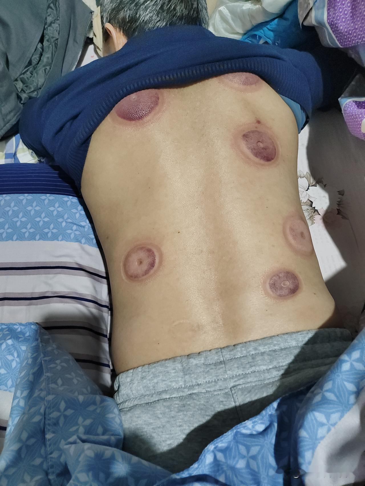 看着好吓人啊!这是儿子从网上买的新式拔火罐神器留下的杰作,先是拿他妈做试验,在老